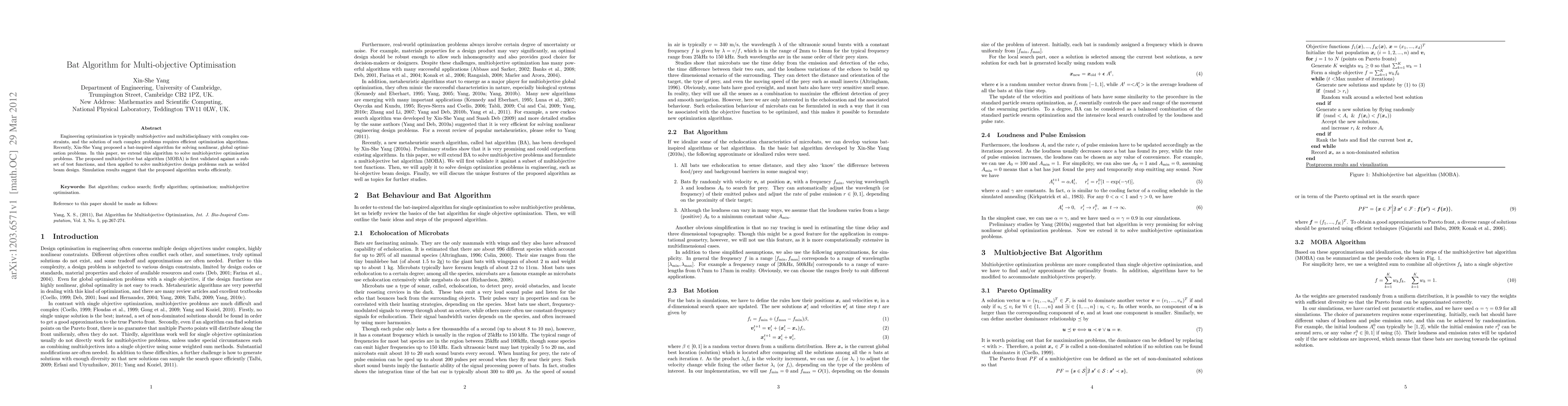 A new algorithm called Multiobjective Bat Algorithm (MOBA) is proposed to solve complex multi-objective optimization problems, with promising results in welding beam design.