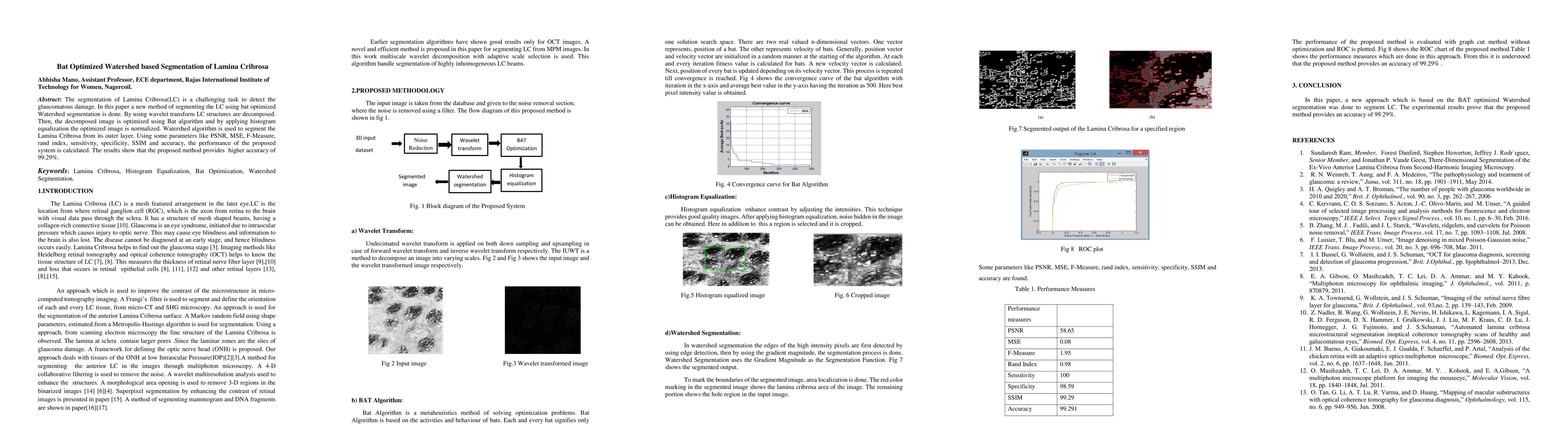 This paper proposes a new method for segmenting Lamina Cribrosa using bat-optimized Watershed segmentation, combining wavelet transform, histogram equalization, and optimization via the Bat algorithm. The method achieves high accuracy of 99.29% in detecting glaucomatous damage, as evaluated by various performance metrics.