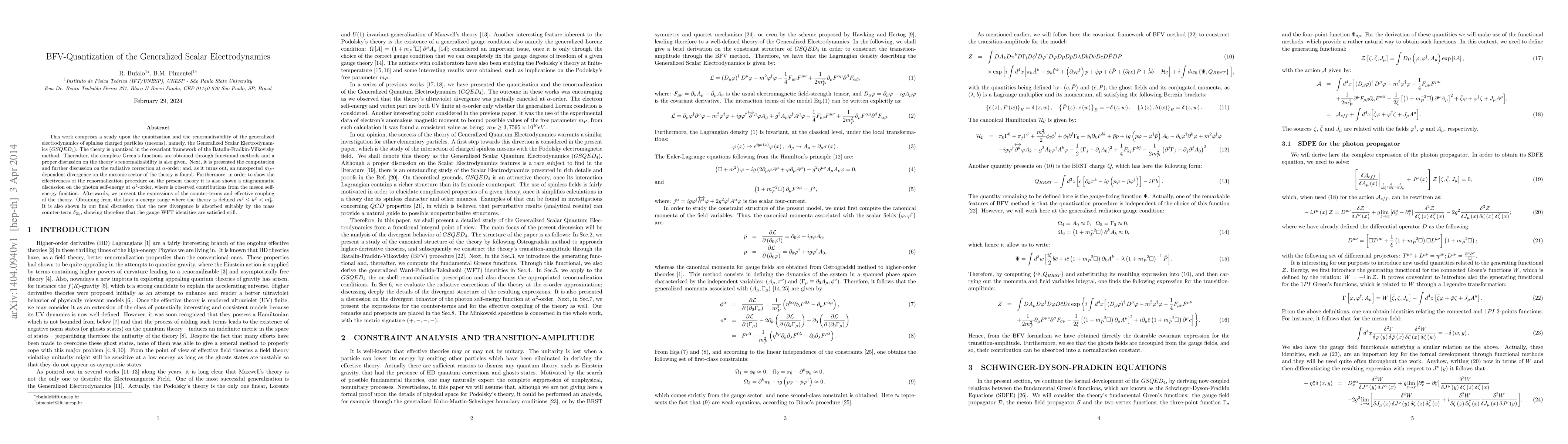 This paper quantizes Generalized Scalar Electrodynamics using the Batalin-Fradkin-Vilkovisky method, discusses renormalizability, and identifies an unexpected $m_{P}$-dependent divergence in the mesonic sector, which is absorbed by the mass counter-term $\delta_{Z_{0}}$, maintaining gauge WFT identities.