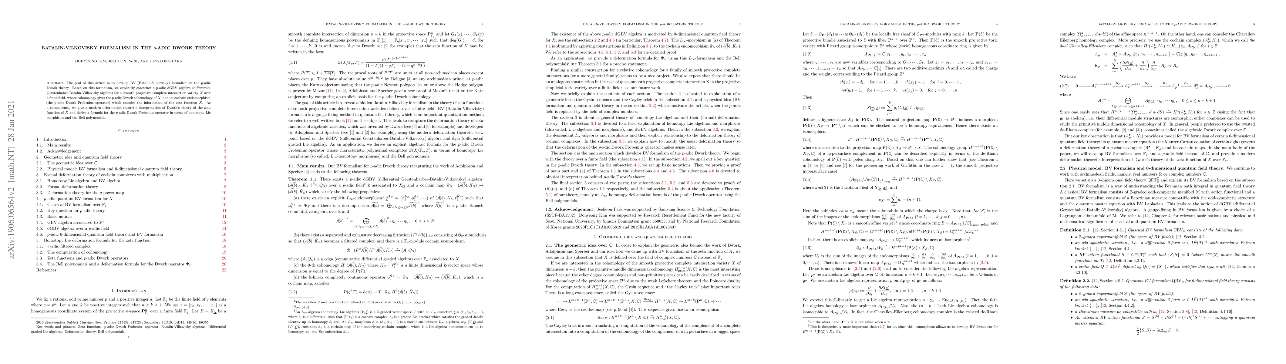 The goal of this article is to develop BV (Batalin-Vilkovisky) formalism in the $p$-adic Dwork theory. Based on this formalism, we explicitly construct a $p$-adic dGBV algebra (differential Gerstenhaber-Batalin-Vilkovisky algebra) for a smooth projective complete intersection variety $X$ over a finite field, whose cohomology gives the $p$-adic Dwork cohomology of $X$, and its cochain endomorphism (the $p$-adic Dwork Frobenius operator) which encodes the information of the zeta function $X$. As a consequence, we give a modern deformation theoretic interpretation of Dwork's theory of the zeta function of $X$ and derive a formula for the $p$-adic Dwork Frobenius operator in terms of homotopy Lie morphisms and the Bell polynomials.