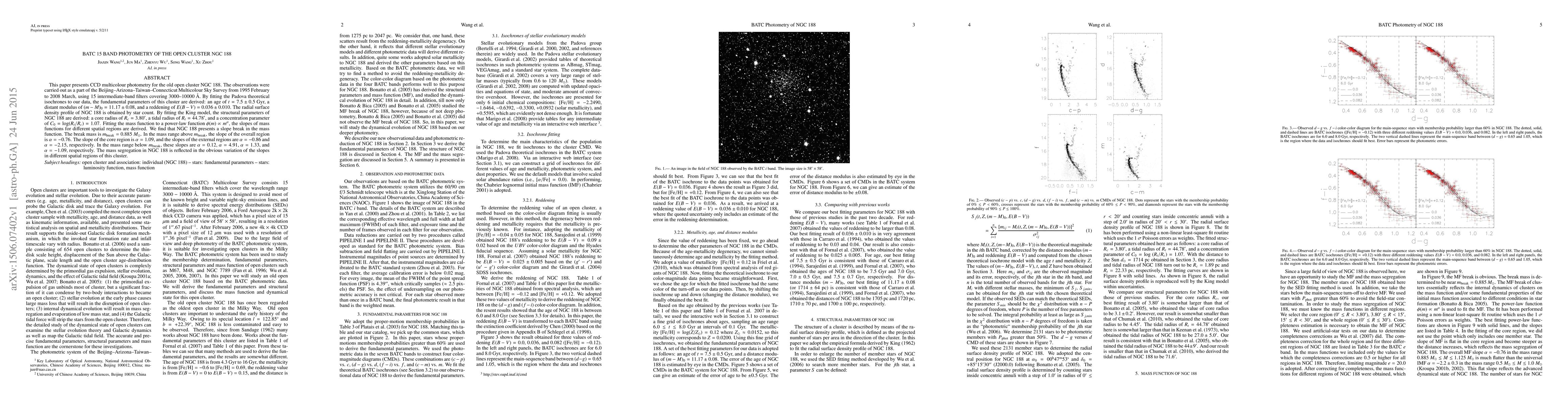 This paper presents CCD multicolour photometry for the old open cluster NGC 188. The observations were carried out as a part of the Beijing--Arizona--Taiwan--Connecticut Multicolour Sky Survey from 1995 February to 2008 March, using 15 intermediate-band filters covering 3000--10000 \AA. By fitting the Padova theoretical isochrones to our data, the fundamental parameters of this cluster are derived: an age of $t=7.5\pm 0.5$ Gyr, a distant modulus of $(m-M)_0=11.17\pm0.08$, and a reddening of $E(B-V)=0.036\pm0.010$. The radial surface density profile of NGC 188 is obtained by star count. By fitting the King model, the structural parameters of NGC 188 are derived: a core radius of $R_{c}=3.80'$, a tidal radius of $R_{t}=44.78'$, and a concentration parameter of $C_{0}=\log(R_{t}/R_{c})=1.07$. Fitting the mass function to a power-law function $\phi(m) \propto m^{\alpha}$, the slopes of mass functions for different spatial regions are derived. We find that NGC 188 presents a slope break in the mass function. The break mass is $m_{\rm break}=0.885~M_{\odot}$. In the mass range above $m_{\rm break}$, the slope of the overall region is $\alpha=-0.76$. The slope of the core region is $\alpha=1.09$, and the slopes of the external regions are $\alpha=-0.86$ and $\alpha=-2.15$, respectively. In the mass range below $m_{\rm break}$, these slopes are $\alpha=0.12$, $\alpha=4.91$, $\alpha=1.33$, and $\alpha=-1.09$, respectively. The mass segregation in NGC 188 is reflected in the obvious variation of the slopes in different spatial regions of this cluster.