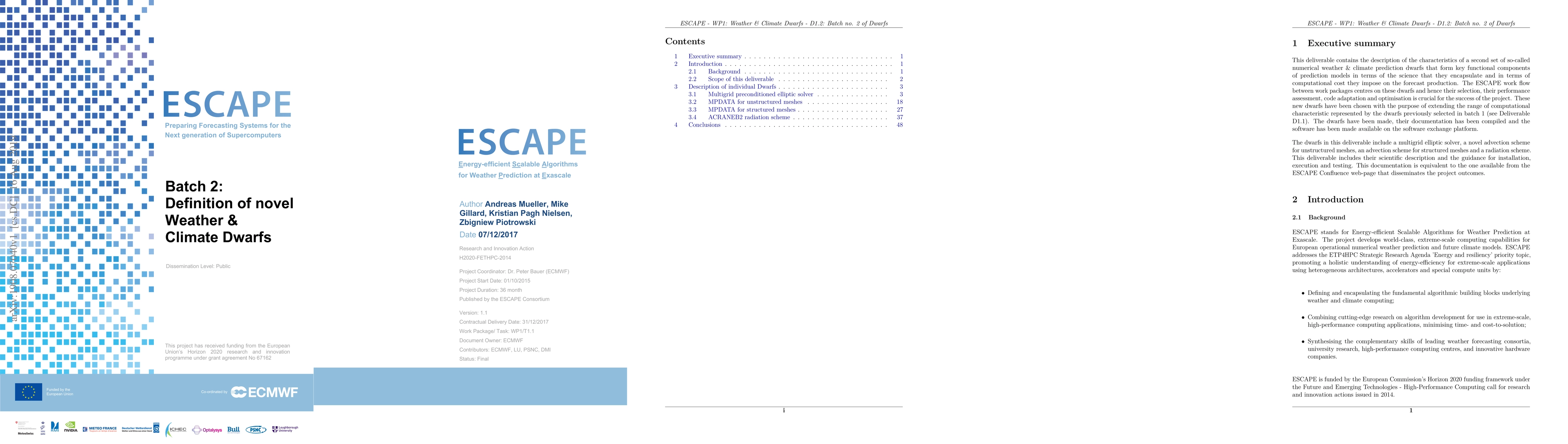 This document is one of the deliverable reports created for the ESCAPE project. ESCAPE stands for Energy-efficient Scalable Algorithms for Weather Prediction at Exascale. The project develops world-class, extreme-scale computing capabilities for European operational numerical weather prediction and future climate models. This is done by identifying weather & climate dwarfs which are key patterns in terms of computation and communication (in the spirit of the Berkeley dwarfs). These dwarfs are then optimised for different hardware architectures (single and multi-node) and alternative algorithms are explored. Performance portability is addressed through the use of domain specific languages. This deliverable contains the description of the characteristics of a second set of so-called numerical weather & climate prediction dwarfs that form key functional components of prediction models in terms of the science that they encapsulate and in terms of computational cost they impose on the forecast production. The ESCAPE work flow between work packages centres on these dwarfs and hence their selection, their performance assessment, code adaptation and optimisation is crucial for the success of the project. These new dwarfs have been chosen with the purpose of extending the range of computational characteristic represented by the dwarfs previously selected in batch 1 (see Deliverable D1.1). The dwarfs have been made, their documentation has been compiled and the software has been made available on the software exchange platform. The dwarfs in this deliverable include a multigrid elliptic solver, a novel advection scheme for unstructured meshes, an advection scheme for structured meshes and a radiation scheme. This deliverable includes their scientific description and the guidance for installation, execution and testing.