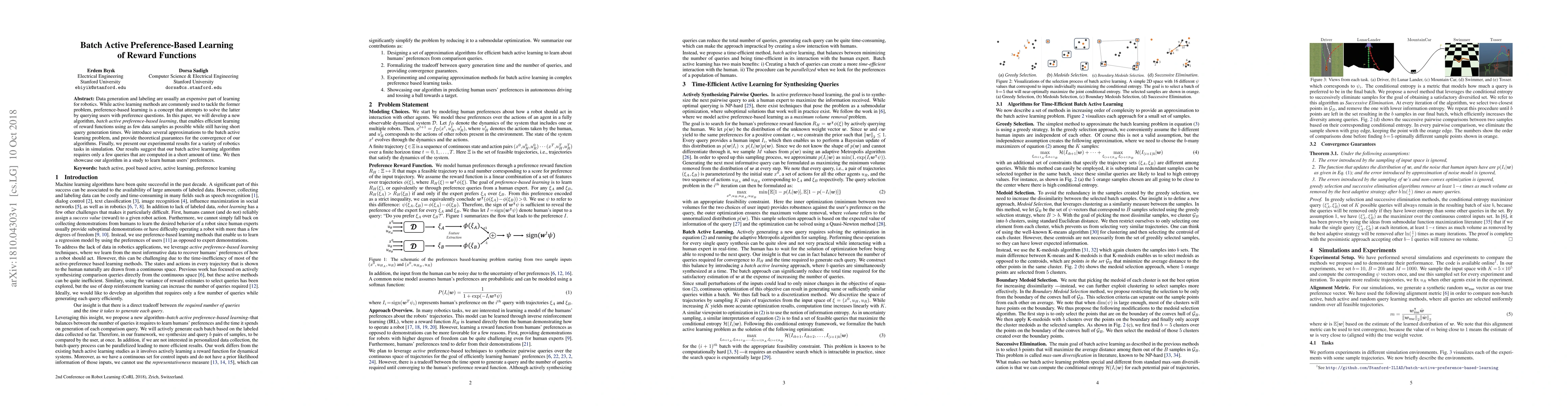 This paper introduces a new batch active preference-based learning algorithm for efficiently acquiring reward functions in robotics with minimal user queries and short query times. The authors provide theoretical convergence guarantees and demonstrate the effectiveness of their approach through simulations and experiments on various robotics tasks.