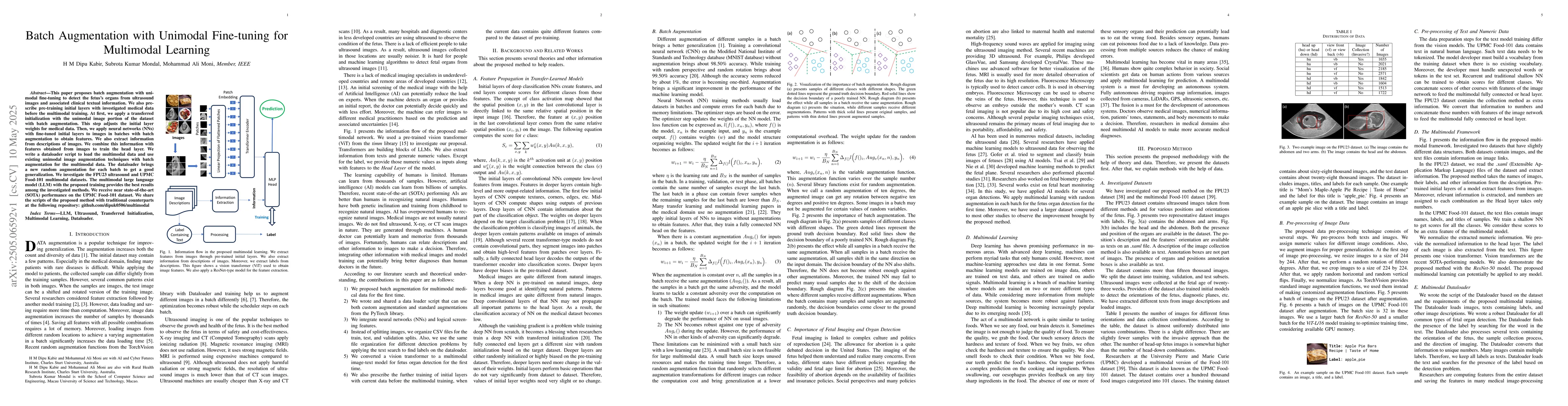 This paper proposes batch augmentation with unimodal fine-tuning to detect the fetus's organs from ultrasound images and associated clinical textual information. We also prescribe pre-training initial layers with investigated medical data before the multimodal training. At first, we apply a transferred initialization with the unimodal image portion of the dataset with batch augmentation. This step adjusts the initial layer weights for medical data. Then, we apply neural networks (NNs) with fine-tuned initial layers to images in batches with batch augmentation to obtain features. We also extract information from descriptions of images. We combine this information with features obtained from images to train the head layer. We write a dataloader script to load the multimodal data and use existing unimodal image augmentation techniques with batch augmentation for the multimodal data. The dataloader brings a new random augmentation for each batch to get a good generalization. We investigate the FPU23 ultrasound and UPMC Food-101 multimodal datasets. The multimodal large language model (LLM) with the proposed training provides the best results among the investigated methods. We receive near state-of-the-art (SOTA) performance on the UPMC Food-101 dataset. We share the scripts of the proposed method with traditional counterparts at the following repository: github.com/dipuk0506/multimodal