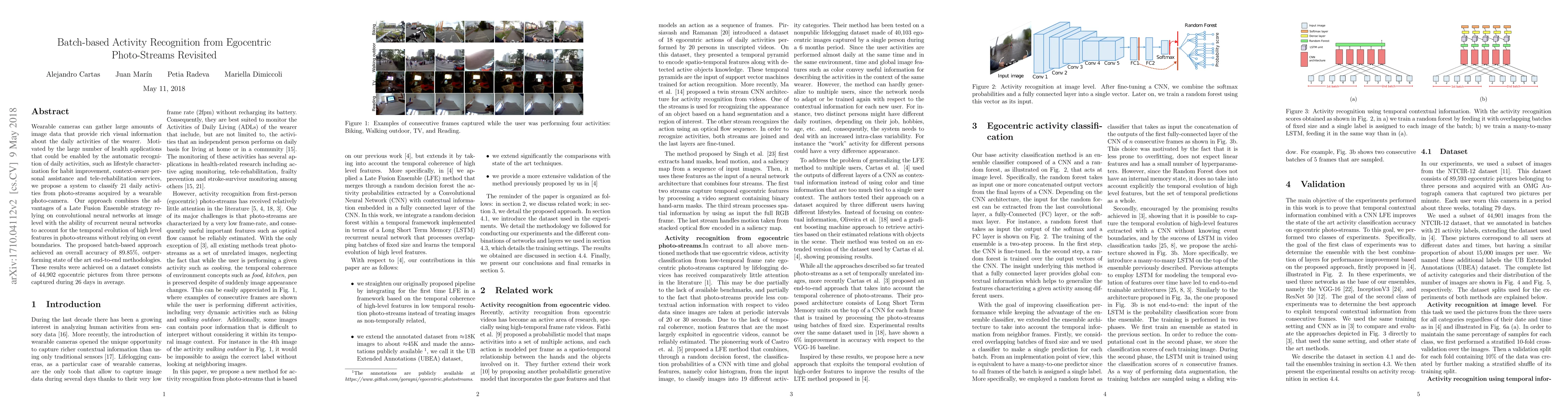 Wearable cameras can gather large a\-mounts of image data that provide rich visual information about the daily activities of the wearer. Motivated by the large number of health applications that could be enabled by the automatic recognition of daily activities, such as lifestyle characterization for habit improvement, context-aware personal assistance and tele-rehabilitation services, we propose a system to classify 21 daily activities from photo-streams acquired by a wearable photo-camera. Our approach combines the advantages of a Late Fusion Ensemble strategy relying on convolutional neural networks at image level with the ability of recurrent neural networks to account for the temporal evolution of high level features in photo-streams without relying on event boundaries. The proposed batch-based approach achieved an overall accuracy of 89.85\%, outperforming state of the art end-to-end methodologies. These results were achieved on a dataset consists of 44,902 egocentric pictures from three persons captured during 26 days in average.