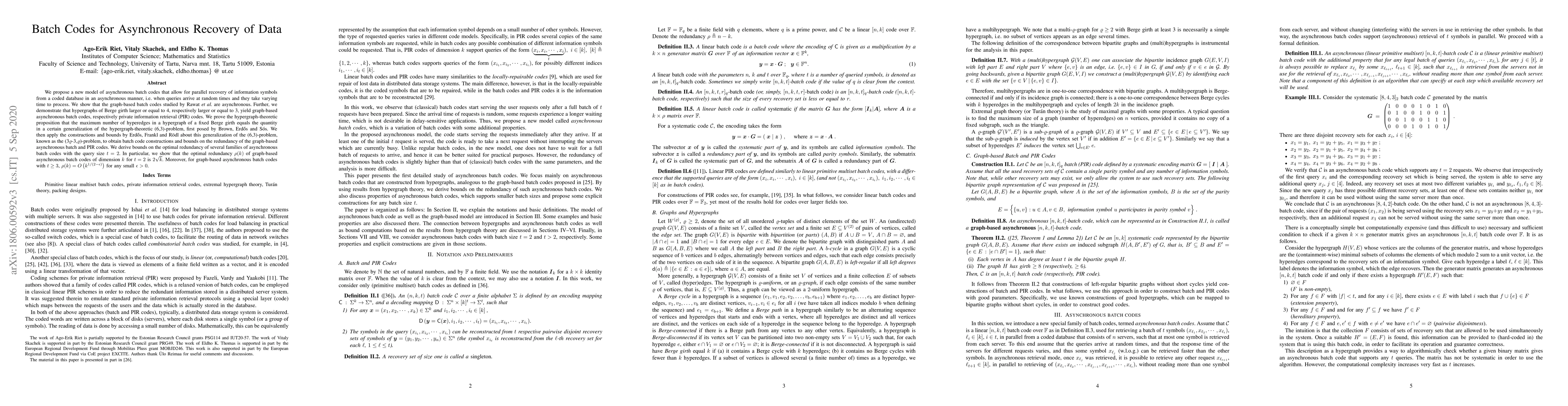 This paper introduces a new asynchronous batch code model for parallel data recovery under random query arrival times and varying processing times. It demonstrates that hypergraphs of specific Berge girths yield efficient graph-based asynchronous batch codes and private information retrieval codes, and derives optimal redundancy bounds for these codes, showing that the optimal redundancy scales with the dimension of the code.