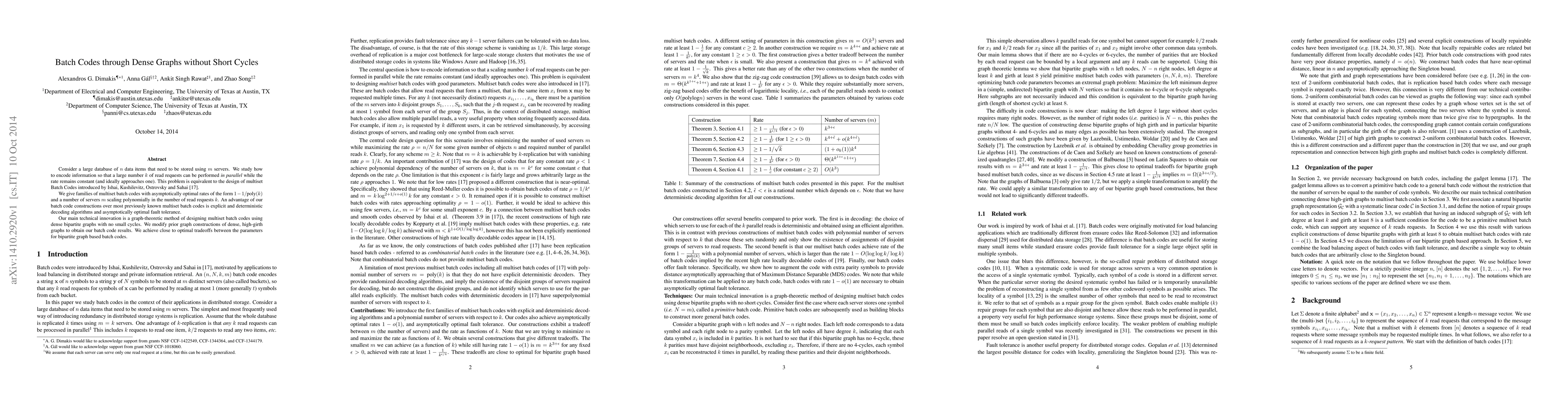 Consider a large database of $n$ data items that need to be stored using $m$ servers. We study how to encode information so that a large number $k$ of read requests can be performed in parallel while the rate remains constant (and ideally approaches one). This problem is equivalent to the design of multiset Batch Codes introduced by Ishai, Kushilevitz, Ostrovsky and Sahai [17]. We give families of multiset batch codes with asymptotically optimal rates of the form $1-1/\text{poly}(k)$ and a number of servers $m$ scaling polynomially in the number of read requests $k$. An advantage of our batch code constructions over most previously known multiset batch codes is explicit and deterministic decoding algorithms and asymptotically optimal fault tolerance. Our main technical innovation is a graph-theoretic method of designing multiset batch codes using dense bipartite graphs with no small cycles. We modify prior graph constructions of dense, high-girth graphs to obtain our batch code results. We achieve close to optimal tradeoffs between the parameters for bipartite graph based batch codes.