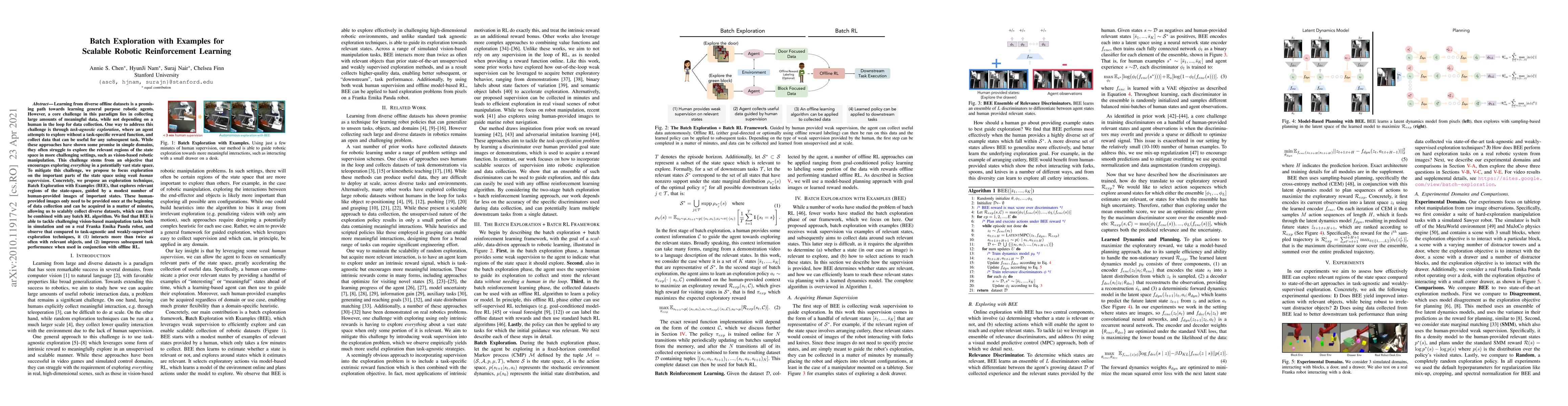 Learning from diverse offline datasets is a promising path towards learning general purpose robotic agents. However, a core challenge in this paradigm lies in collecting large amounts of meaningful data, while not depending on a human in the loop for data collection. One way to address this challenge is through task-agnostic exploration, where an agent attempts to explore without a task-specific reward function, and collect data that can be useful for any downstream task. While these approaches have shown some promise in simple domains, they often struggle to explore the relevant regions of the state space in more challenging settings, such as vision based robotic manipulation. This challenge stems from an objective that encourages exploring everything in a potentially vast state space. To mitigate this challenge, we propose to focus exploration on the important parts of the state space using weak human supervision. Concretely, we propose an exploration technique, Batch Exploration with Examples (BEE), that explores relevant regions of the state-space, guided by a modest number of human provided images of important states. These human provided images only need to be collected once at the beginning of data collection and can be collected in a matter of minutes, allowing us to scalably collect diverse datasets, which can then be combined with any batch RL algorithm. We find that BEE is able to tackle challenging vision-based manipulation tasks both in simulation and on a real Franka robot, and observe that compared to task-agnostic and weakly-supervised exploration techniques, it (1) interacts more than twice as often with relevant objects, and (2) improves downstream task performance when used in conjunction with offline RL.