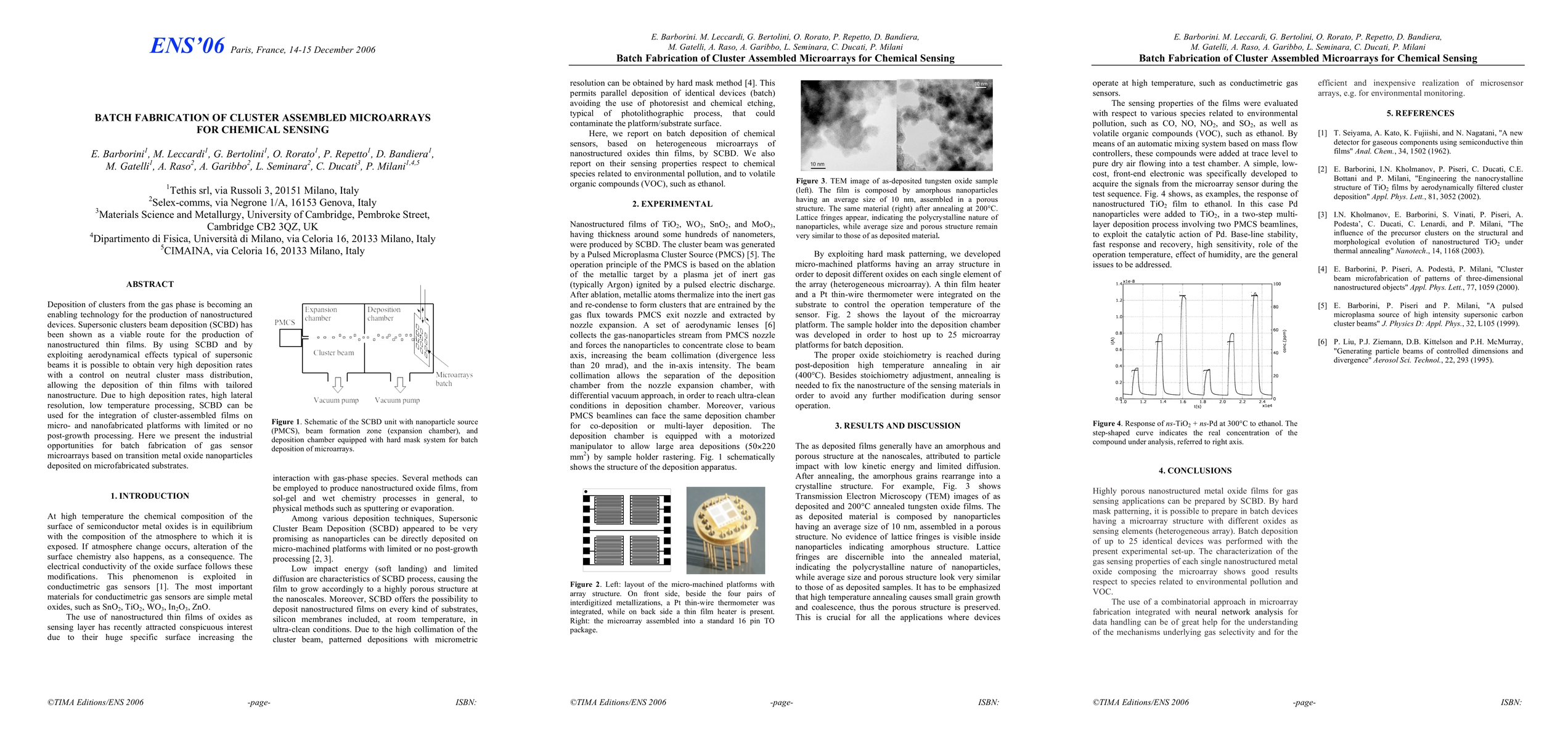Deposition of clusters from the gas phase is becoming an enabling technology for the production of nanostructured devices. Supersonic clusters beam deposition (SCBD) has been shown as a viable route for the production of nanostructured thin films. By using SCBD and by exploiting aerodynamical effects typical of supersonic beams it is possible to obtain very high deposition rates with a control on neutral cluster mass distribution, allowing the deposition of thin films with tailored nanostructure. Due to high deposition rates, high lateral resolution, low temperature processing, SCBD can be used for the integration of cluster-assembled films on micro- and nanofabricated platforms with limited or no post-growth processing. Here we present the industrial opportunities for batch fabrication of gas sensor microarrays based on transition metal oxide nanoparticles deposited on microfabricated substrates.