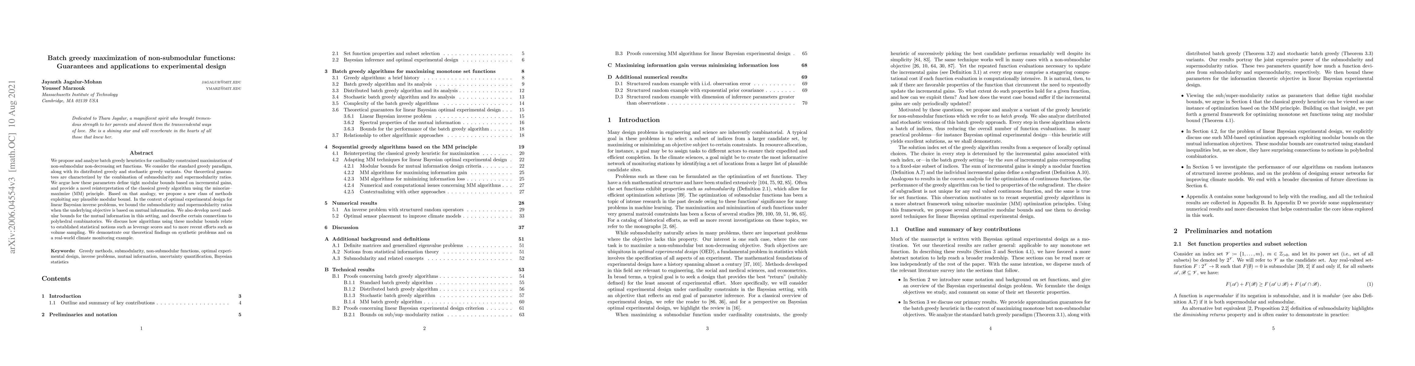 We propose and analyze batch greedy heuristics for cardinality constrained maximization of non-submodular non-decreasing set functions. We consider the standard greedy paradigm, along with its distributed greedy and stochastic greedy variants. Our theoretical guarantees are characterized by the combination of submodularity and supermodularity ratios. We argue how these parameters define tight modular bounds based on incremental gains, and provide a novel reinterpretation of the classical greedy algorithm using the minorize-maximize (MM) principle. Based on that analogy, we propose a new class of methods exploiting any plausible modular bound. In the context of optimal experimental design for linear Bayesian inverse problems, we bound the submodularity and supermodularity ratios when the underlying objective is based on mutual information. We also develop novel modular bounds for the mutual information in this setting, and describe certain connections to polyhedral combinatorics. We discuss how algorithms using these modular bounds relate to established statistical notions such as leverage scores and to more recent efforts such as volume sampling. We demonstrate our theoretical findings on synthetic problems and on a real-world climate monitoring example.