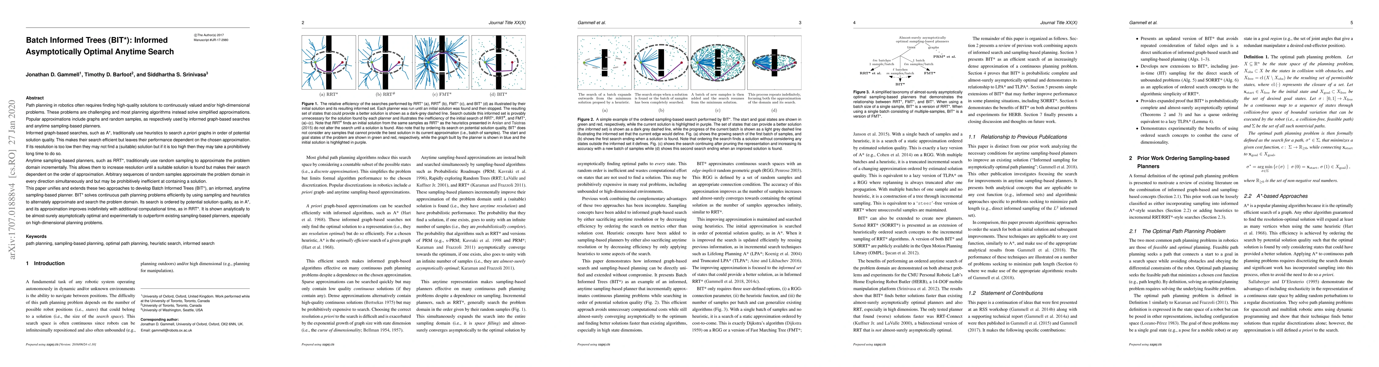 Batch Informed Trees (BIT*) is an anytime search planner that combines sampling and heuristics to efficiently solve continuous path planning problems in robotics. It outperforms existing planners on high-dimensional problems and is analytically shown to be asymptotically optimal.