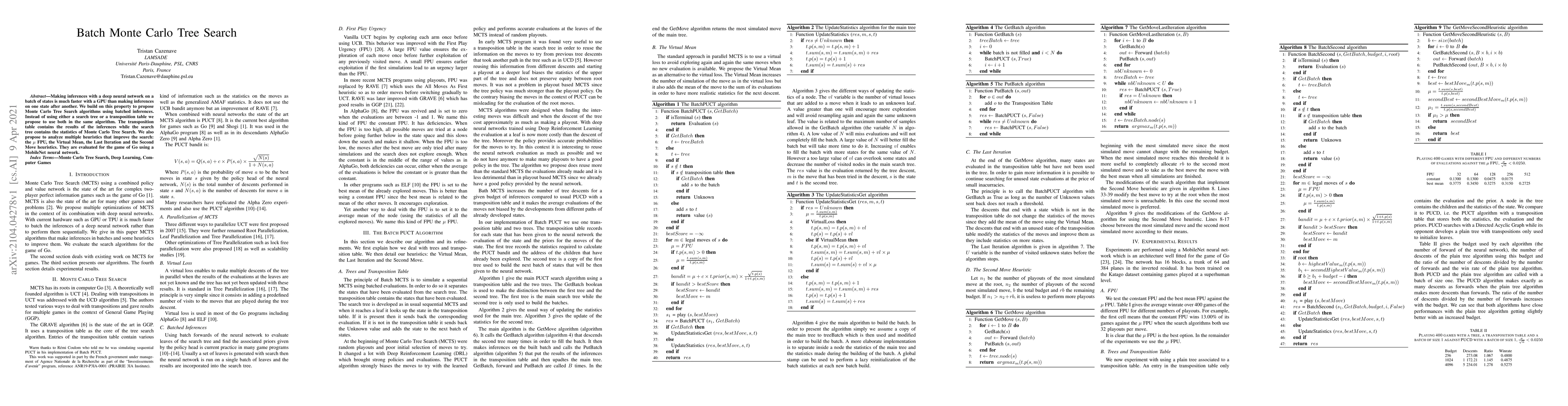 Making inferences with a deep neural network on a batch of states is much faster with a GPU than making inferences on one state after another. We build on this property to propose Monte Carlo Tree Search algorithms using batched inferences. Instead of using either a search tree or a transposition table we propose to use both in the same algorithm. The transposition table contains the results of the inferences while the search tree contains the statistics of Monte Carlo Tree Search. We also propose to analyze multiple heuristics that improve the search: the $\mu$ FPU, the Virtual Mean, the Last Iteration and the Second Move heuristics. They are evaluated for the game of Go using a MobileNet neural network.