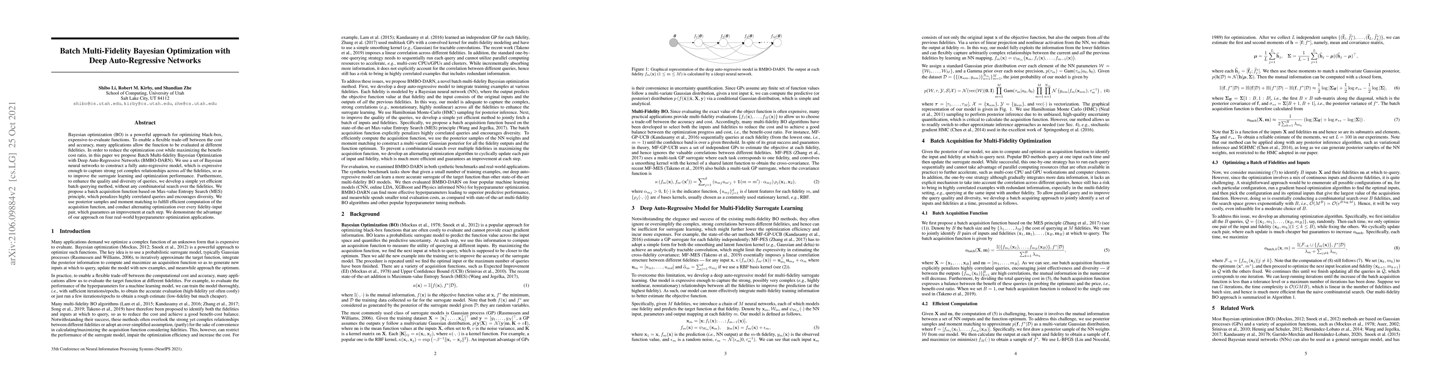 This paper proposes Batch Multi-fidelity Bayesian Optimization with Deep Auto-Regressive Networks (BMBO-DARN) to optimize expensive black-box functions at different fidelities. It uses Bayesian neural networks to construct an auto-regressive model for improved surrogate learning and employs a batch querying method with a Max-value Entropy Search (MES) based acquisition function to enhance query diversity and optimize performance.