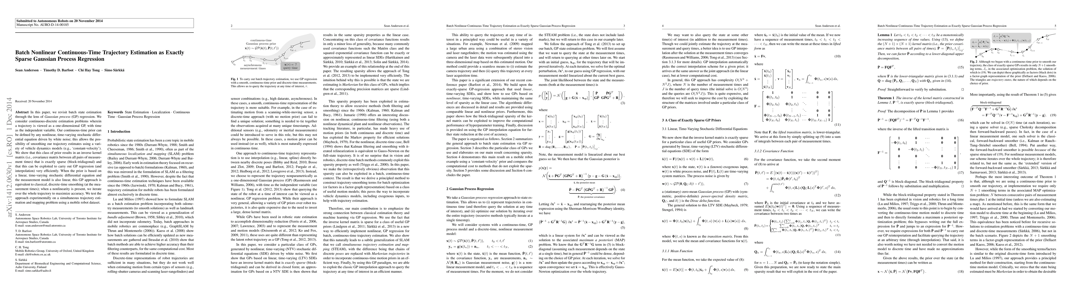 This paper proposes a Gaussian process regression method for batch nonlinear continuous-time trajectory estimation, leveraging an exactly sparse inverse kernel matrix for efficient computation. The approach is tested on a mobile robot dataset for simultaneous trajectory estimation and mapping.