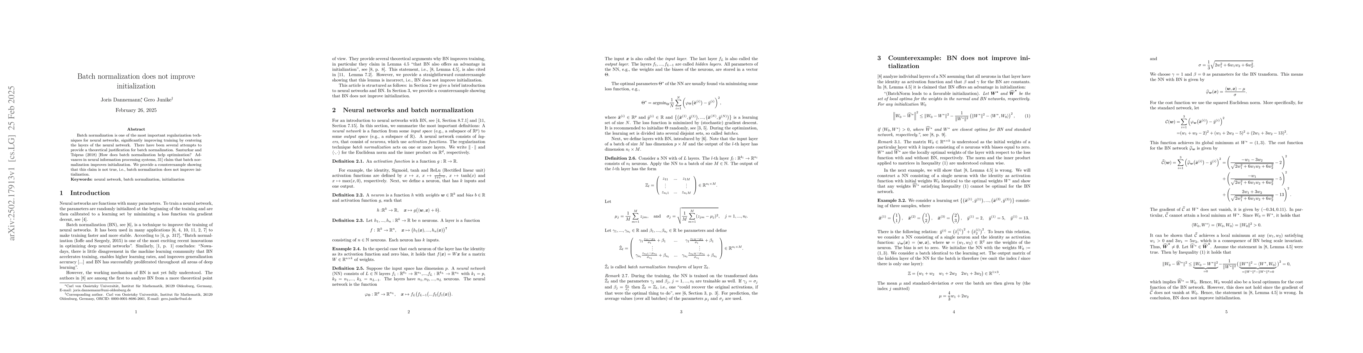 Summary: This research refutes the claim that batch normalization improves initialization, presenting evidence that it does not enhance the starting conditions for training neural networks, despite its benefits in regularization and training efficiency.