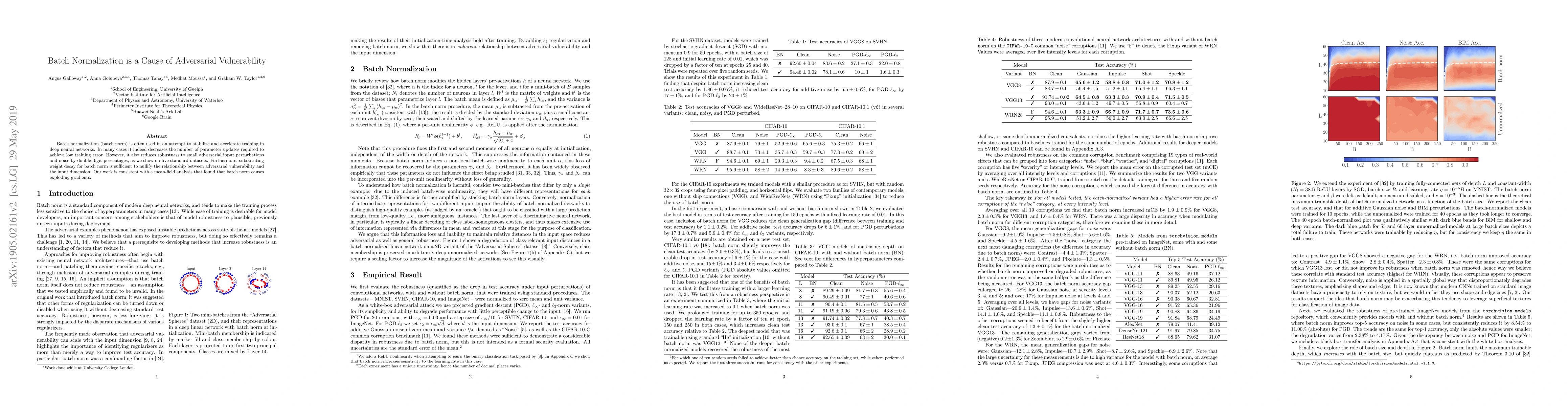 Batch normalization (batch norm) is often used in an attempt to stabilize and accelerate training in deep neural networks. In many cases it indeed decreases the number of parameter updates required to achieve low training error. However, it also reduces robustness to small adversarial input perturbations and noise by double-digit percentages, as we show on five standard datasets. Furthermore, substituting weight decay for batch norm is sufficient to nullify the relationship between adversarial vulnerability and the input dimension. Our work is consistent with a mean-field analysis that found that batch norm causes exploding gradients.