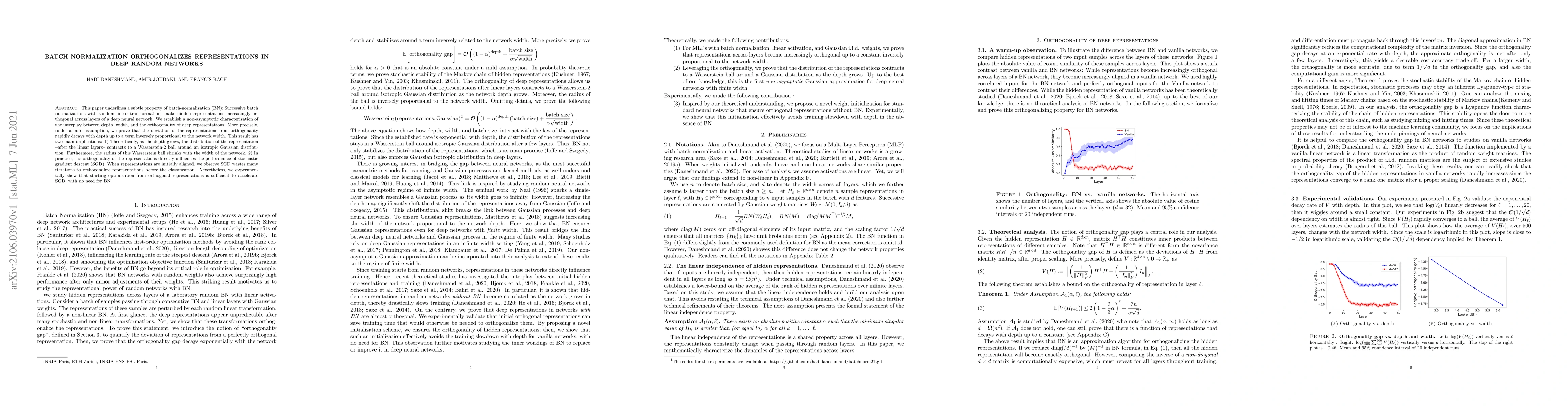 This paper demonstrates that batch normalization in deep random networks leads to increasingly orthogonal hidden representations, which theoretically contracts to an isotropic Gaussian distribution as depth increases. Practically, starting optimization with orthogonal representations can accelerate SGD, bypassing the need for batch normalization.