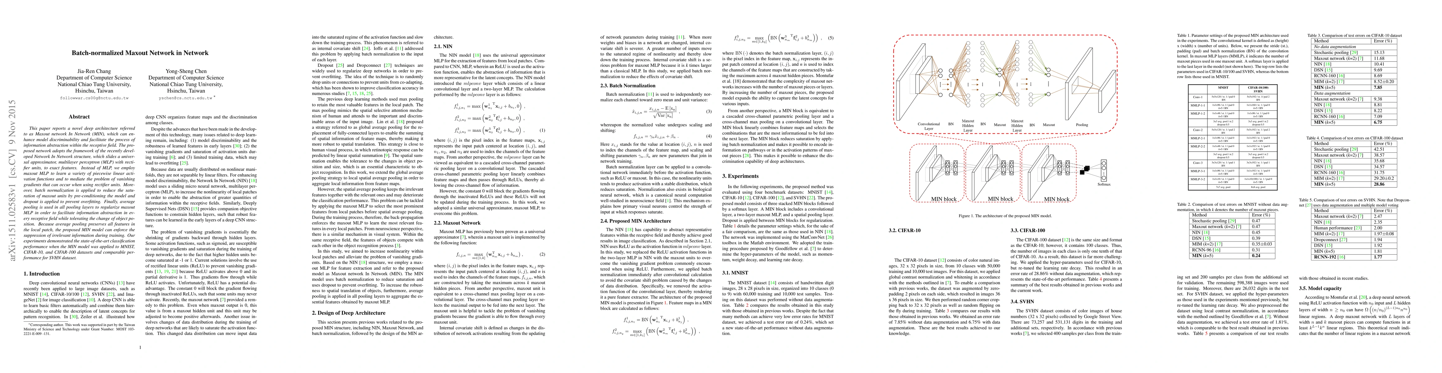 The paper introduces the Maxout Network In Network (MIN) architecture, combining batch normalization, maxout MLPs, and average pooling to enhance discriminability and information abstraction. Experiments show state-of-the-art classification performance on MNIST, CIFAR-10, and CIFAR-100 datasets.