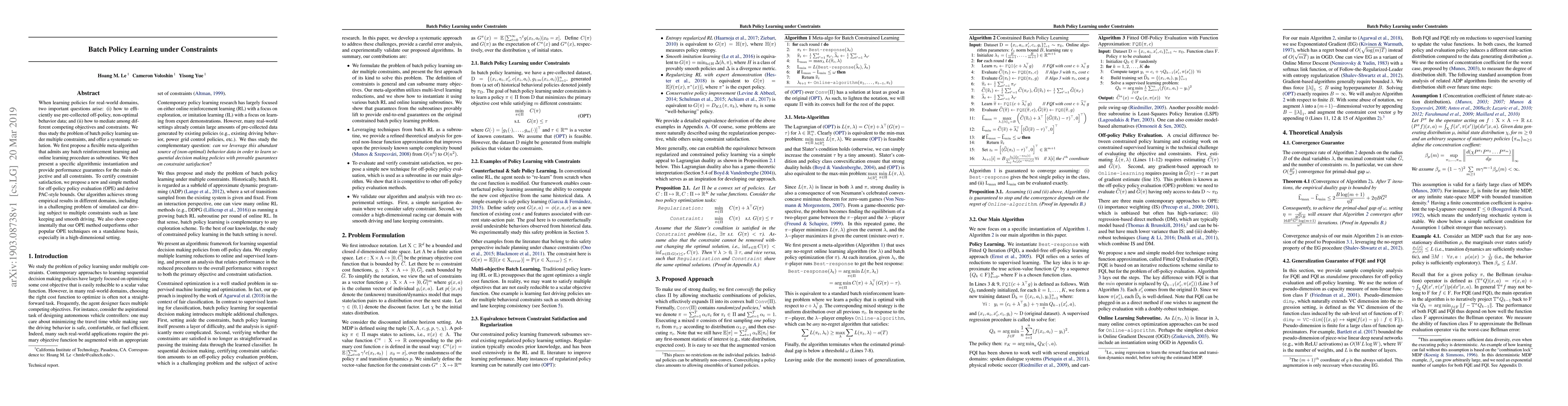 This paper presents a systematic solution to batch policy learning under multiple constraints, offering a flexible meta-algorithm that achieves strong empirical results in various domains.