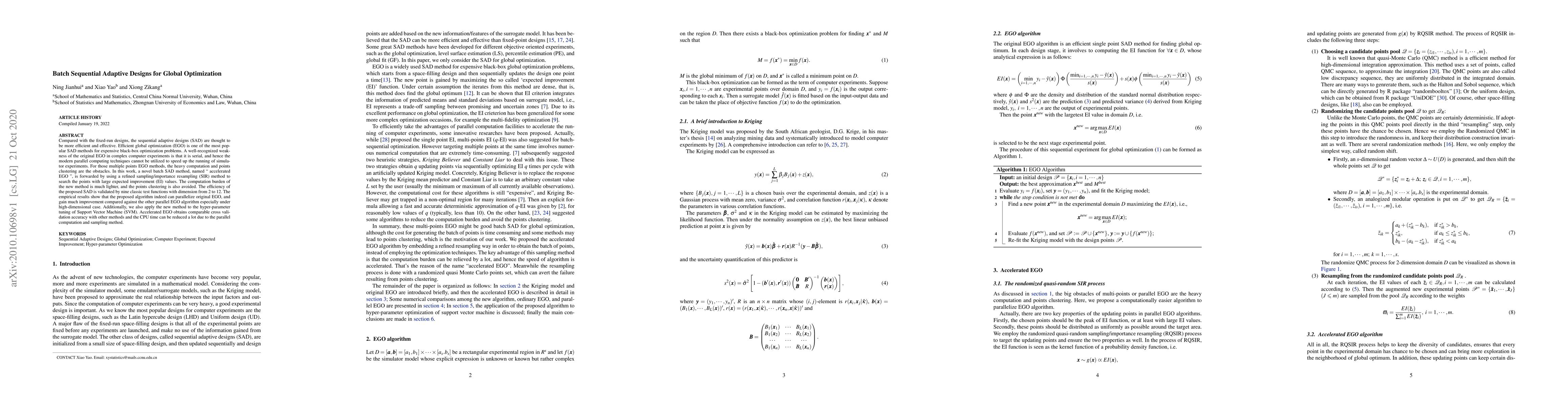 This paper proposes a novel batch sequential adaptive design (SAD) method called "accelerated EGO" for efficient global optimization, which utilizes a refined sampling/importance resampling (SIR) method to parallelize the computation of expensive black-box optimization problems. The new method reduces computation burden and avoids points clustering, demonstrating significant improvements over other parallel EGO algorithms, especially in high-dimensional cases.