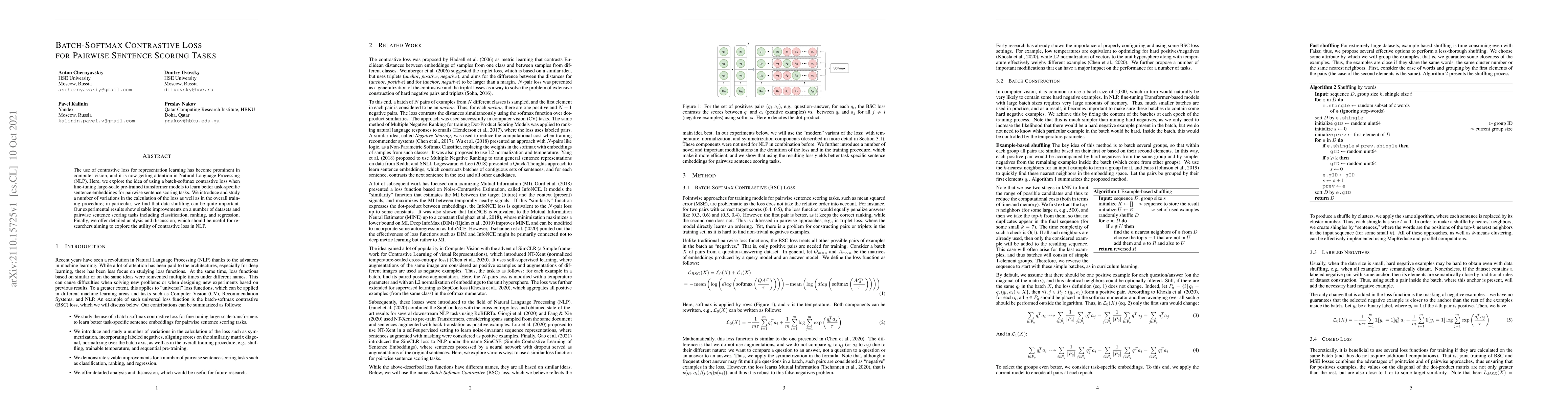The use of contrastive loss for representation learning has become prominent in computer vision, and it is now getting attention in Natural Language Processing (NLP). Here, we explore the idea of using a batch-softmax contrastive loss when fine-tuning large-scale pre-trained transformer models to learn better task-specific sentence embeddings for pairwise sentence scoring tasks. We introduce and study a number of variations in the calculation of the loss as well as in the overall training procedure; in particular, we find that data shuffling can be quite important. Our experimental results show sizable improvements on a number of datasets and pairwise sentence scoring tasks including classification, ranking, and regression. Finally, we offer detailed analysis and discussion, which should be useful for researchers aiming to explore the utility of contrastive loss in NLP.