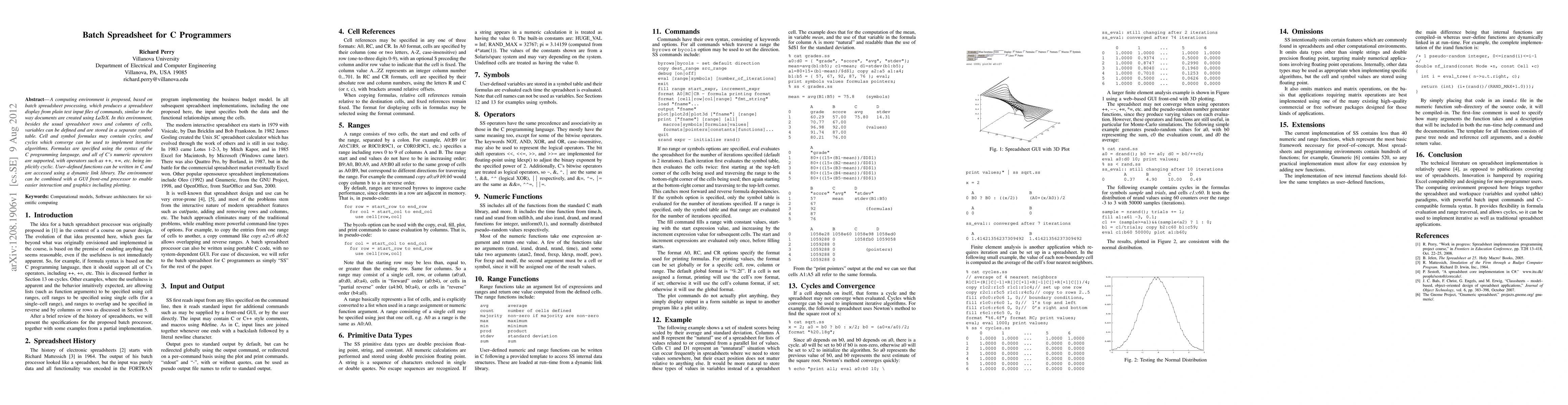 A computing environment is proposed for batch spreadsheet processing using plain text input files, enabling C programmers to create spreadsheet displays with formulas that contain cycles for implementing iterative algorithms.