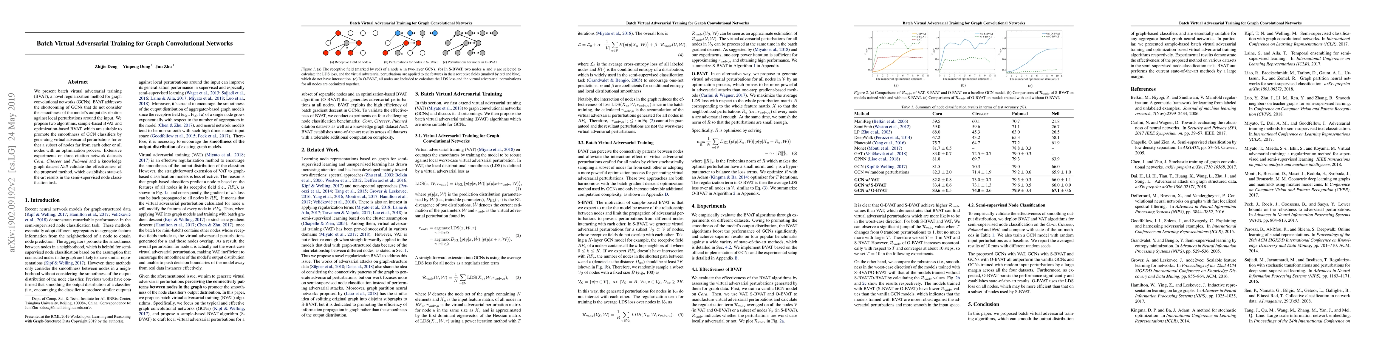 The paper introduces batch virtual adversarial training (BVAT) to regularize graph convolutional networks (GCNs), addressing their lack of robustness to local perturbations. It proposes two BVAT algorithms to enhance model smoothness for graph-structured data, achieving state-of-the-art results in semi-supervised node classification on multiple datasets.