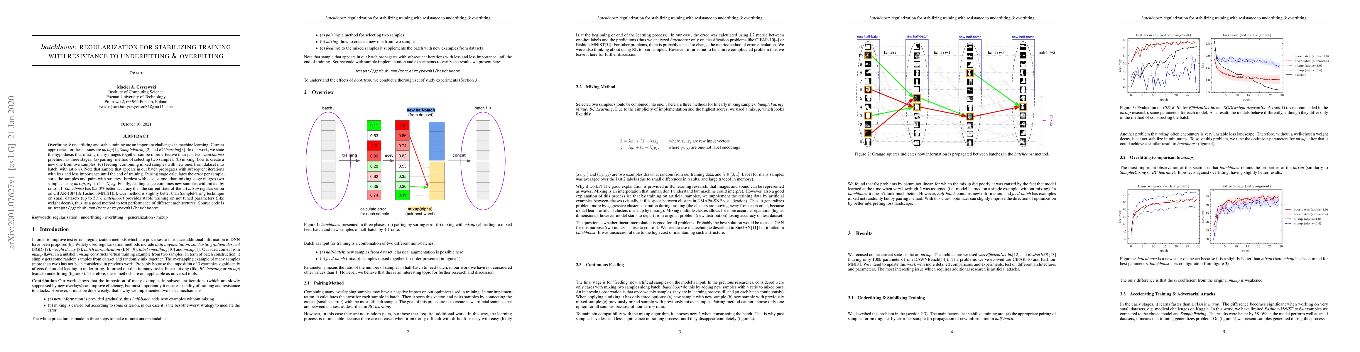 Overfitting & underfitting and stable training are an important challenges in machine learning. Current approaches for these issues are mixup, SamplePairing and BC learning. In our work, we state the hypothesis that mixing many images together can be more effective than just two. Batchboost pipeline has three stages: (a) pairing: method of selecting two samples. (b) mixing: how to create a new one from two samples. (c) feeding: combining mixed samples with new ones from dataset into batch (with ratio $\gamma$). Note that sample that appears in our batch propagates with subsequent iterations with less and less importance until the end of training. Pairing stage calculates the error per sample, sorts the samples and pairs with strategy: hardest with easiest one, than mixing stage merges two samples using mixup, $x_1 + (1-\lambda)x_2$. Finally, feeding stage combines new samples with mixed by ratio 1:1. Batchboost has 0.5-3% better accuracy than the current state-of-the-art mixup regularization on CIFAR-10 & Fashion-MNIST. Our method is slightly better than SamplePairing technique on small datasets (up to 5%). Batchboost provides stable training on not tuned parameters (like weight decay), thus its a good method to test performance of different architectures. Source code is at: https://github.com/maciejczyzewski/batchboost