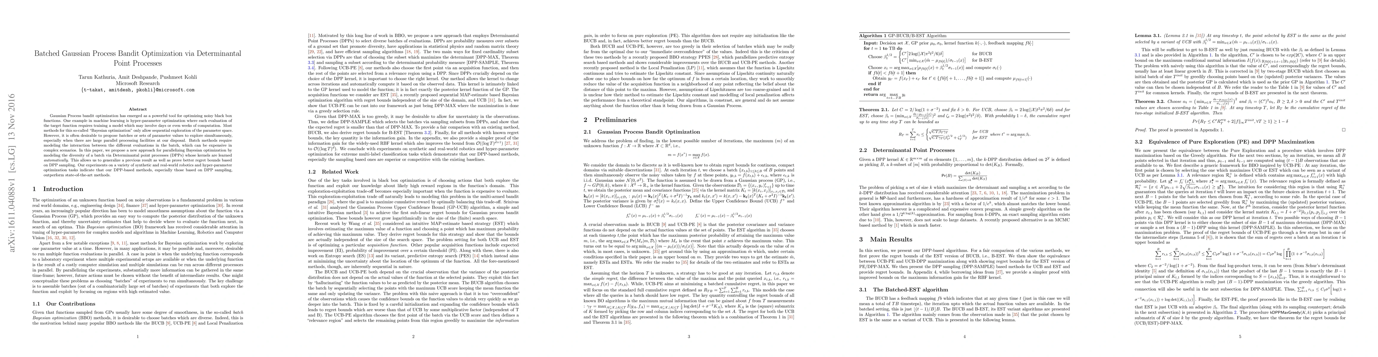 This paper proposes a novel batched Gaussian Process bandit optimization method using Determinantal Point Processes (DPPs) to model batch diversity, enabling parallel exploration of parameter sets. The approach achieves better regret bounds and outperforms existing methods in hyper-parameter optimization and robotics tasks.