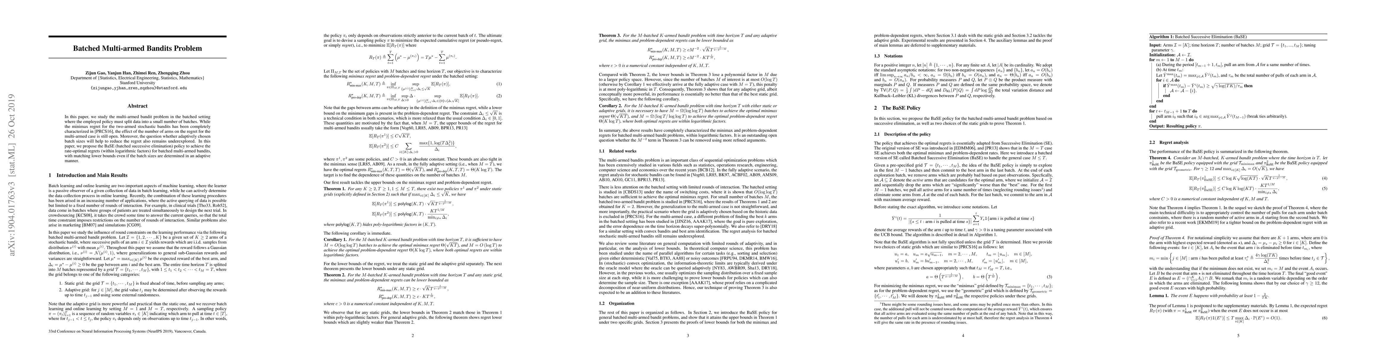 This paper introduces the BaSE policy to address the batched multi-armed bandit problem, aiming to achieve optimal regret rates within logarithmic factors. It also explores the impact of adaptively chosen batch sizes on regret reduction, providing matching lower bounds for adaptive batch size determination.