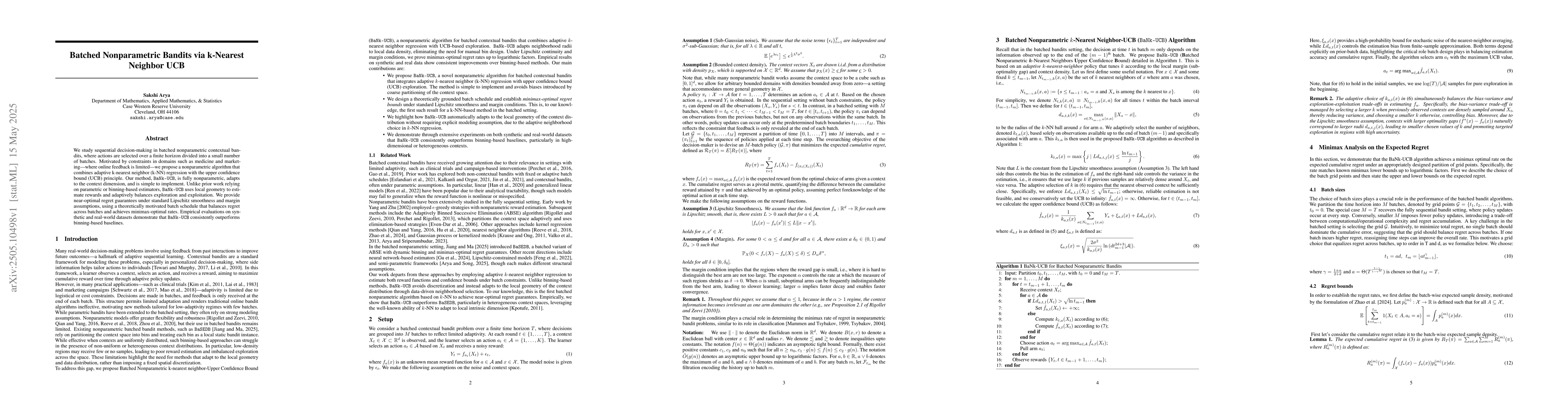 The research proposes BaNk-UCB, a nonparametric algorithm combining adaptive k-nearest neighbor regression with the upper confidence bound principle for batched nonparametric contextual bandits, adapting to context dimension and balancing exploration-exploitation via local geometry under Lipschitz smoothness and margin assumptions.