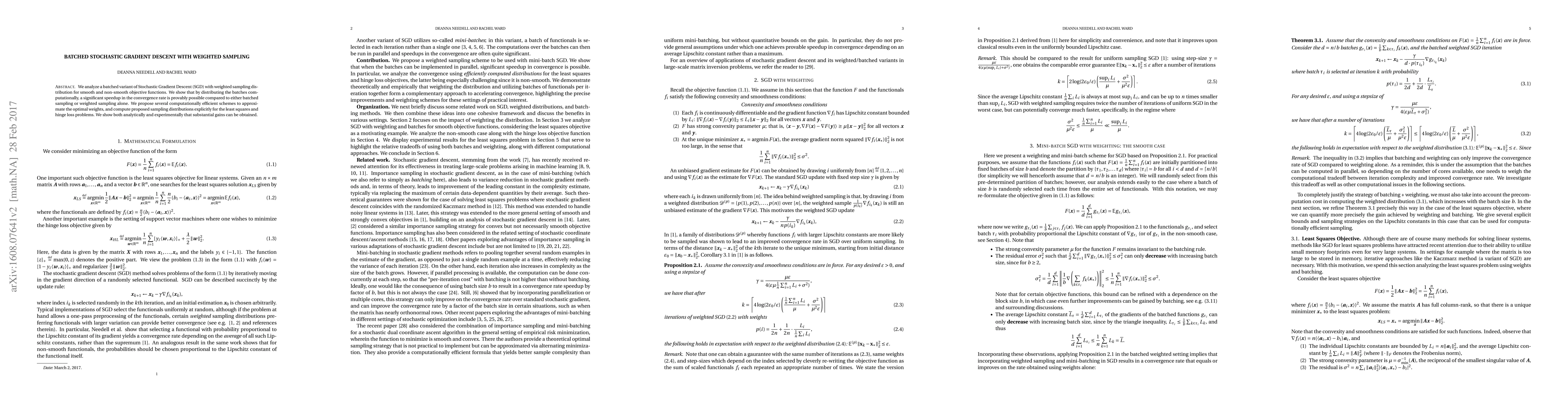 This paper investigates a batched variant of Stochastic Gradient Descent (SGD) with weighted sampling, demonstrating significant convergence speedup over traditional methods. It proposes efficient schemes for approximating optimal weights and shows substantial gains both analytically and experimentally for least squares and hinge loss problems.