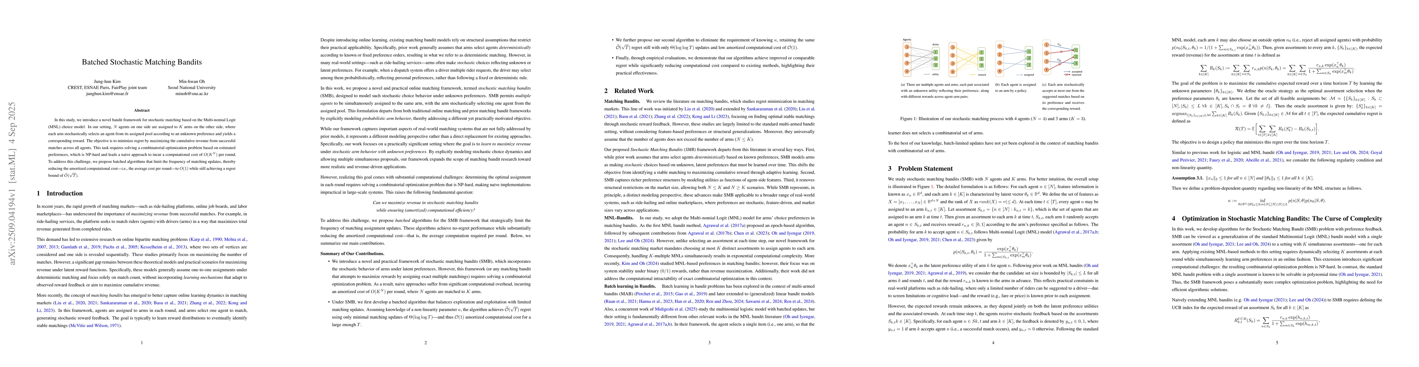In this study, we introduce a novel bandit framework for stochastic matching based on the Multi-nomial Logit (MNL) choice model. In our setting, $N$ agents on one side are assigned to $K$ arms on the other side, where each arm stochastically selects an agent from its assigned pool according to an unknown preference and yields a corresponding reward. The objective is to minimize regret by maximizing the cumulative revenue from successful matches across all agents. This task requires solving a combinatorial optimization problem based on estimated preferences, which is NP-hard and leads a naive approach to incur a computational cost of $O(K^N)$ per round. To address this challenge, we propose batched algorithms that limit the frequency of matching updates, thereby reducing the amortized computational cost (i.e., the average cost per round) to $O(1)$ while still achieving a regret bound of $\tilde{O}(\sqrt{T})$.