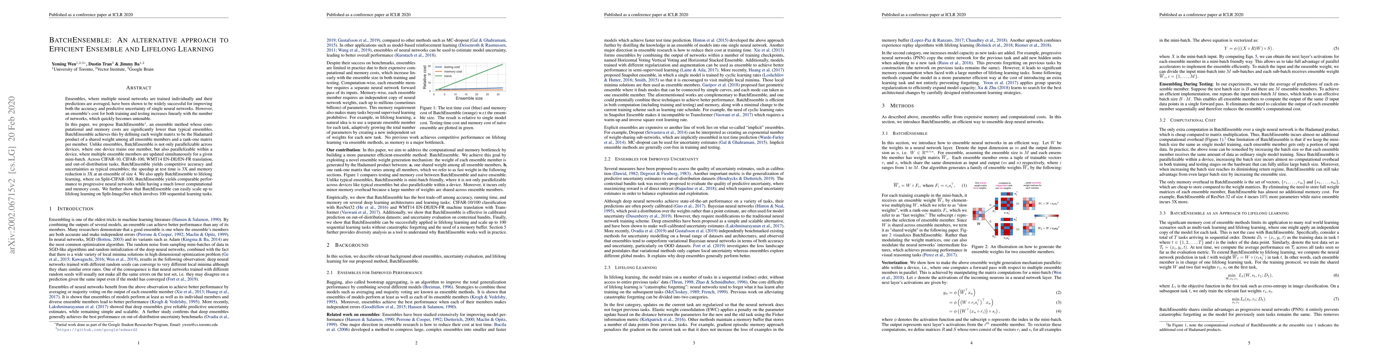 Ensembles, where multiple neural networks are trained individually and their predictions are averaged, have been shown to be widely successful for improving both the accuracy and predictive uncertainty of single neural networks. However, an ensemble's cost for both training and testing increases linearly with the number of networks, which quickly becomes untenable. In this paper, we propose BatchEnsemble, an ensemble method whose computational and memory costs are significantly lower than typical ensembles. BatchEnsemble achieves this by defining each weight matrix to be the Hadamard product of a shared weight among all ensemble members and a rank-one matrix per member. Unlike ensembles, BatchEnsemble is not only parallelizable across devices, where one device trains one member, but also parallelizable within a device, where multiple ensemble members are updated simultaneously for a given mini-batch. Across CIFAR-10, CIFAR-100, WMT14 EN-DE/EN-FR translation, and out-of-distribution tasks, BatchEnsemble yields competitive accuracy and uncertainties as typical ensembles; the speedup at test time is 3X and memory reduction is 3X at an ensemble of size 4. We also apply BatchEnsemble to lifelong learning, where on Split-CIFAR-100, BatchEnsemble yields comparable performance to progressive neural networks while having a much lower computational and memory costs. We further show that BatchEnsemble can easily scale up to lifelong learning on Split-ImageNet which involves 100 sequential learning tasks.