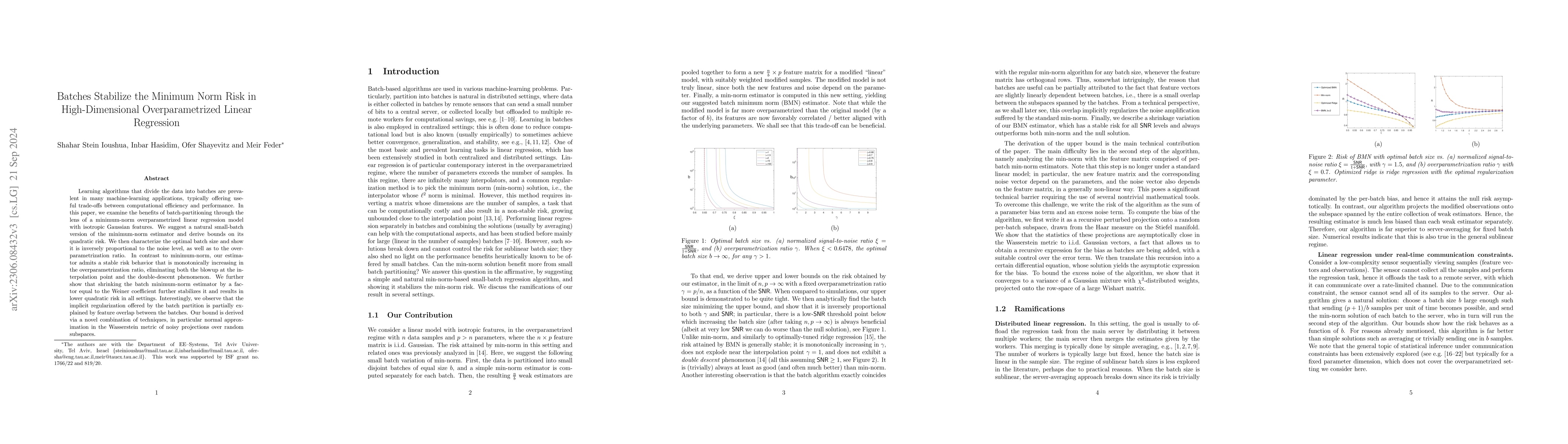 The paper introduces a novel small-batch version of the minimum-norm estimator for overparameterized linear regression, deriving an upper bound on its quadratic risk and demonstrating its stable risk behavior.