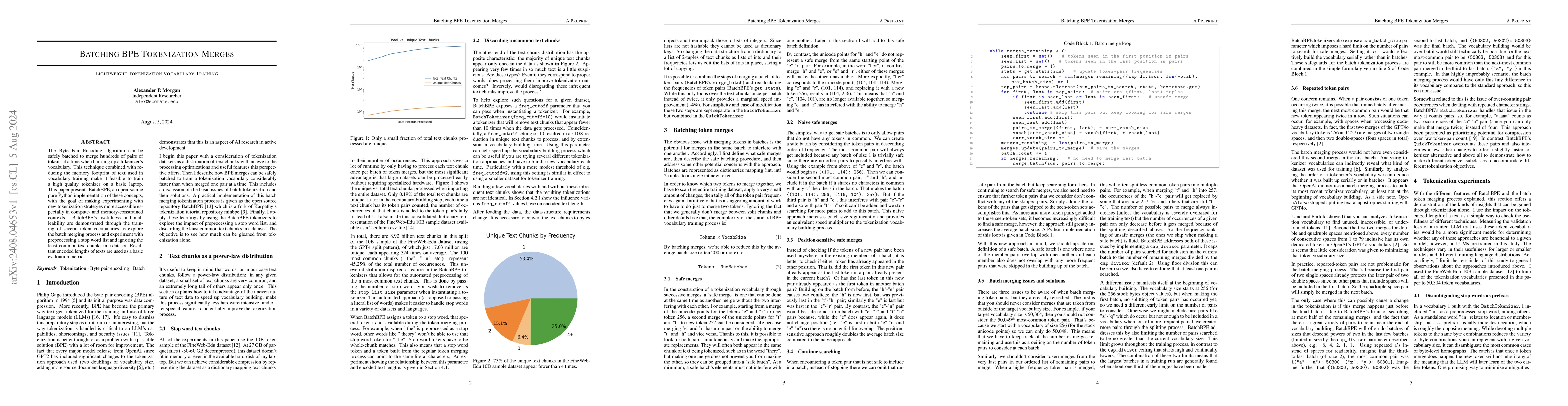 The paper introduces BatchBPE, a Python implementation that allows batching of Byte Pair Encoding (BPE) to merge large numbers of token pairs efficiently, reducing memory usage and enabling high-quality tokenizer training on basic laptops. The method's flexibility is demonstrated through various vocabulary training experiments, highlighting its utility in compute- and memory-constrained environments.