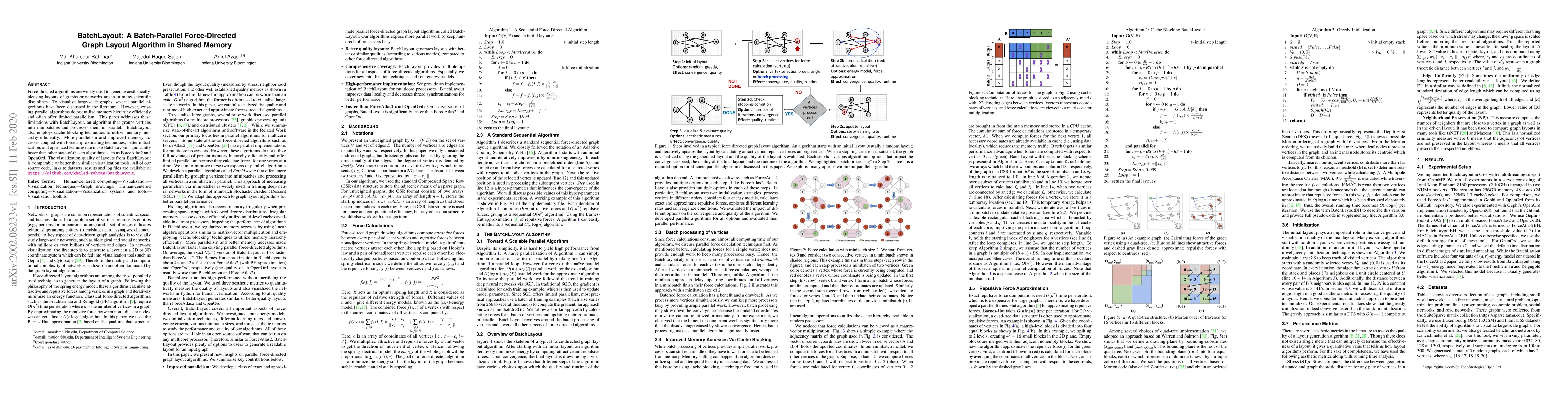 The paper introduces BatchLayout, a highly scalable and efficient parallel force-directed graph layout algorithm that combines minibatch processing and cache-blocking techniques for improved performance on shared memory systems.