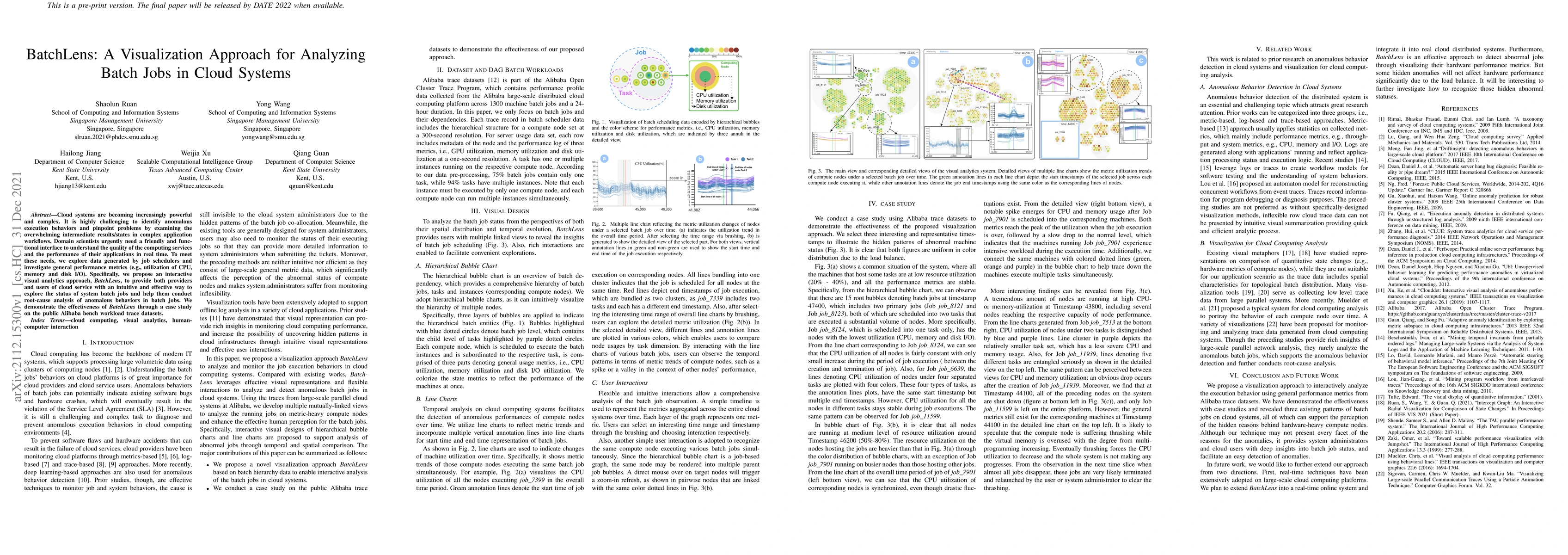 BatchLens is an interactive visual analytics tool that helps users explore batch job status and analyze anomalous behaviors in cloud systems. It provides a friendly interface for providers and users to understand computing service quality and application performance in real-time.