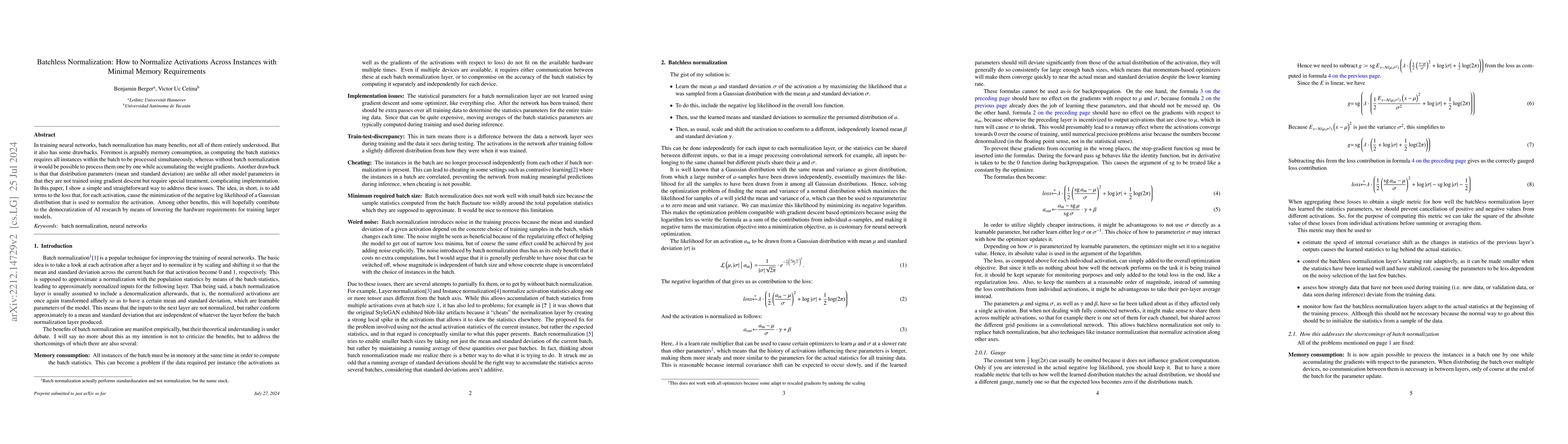 This paper proposes a novel batchless normalization technique to address memory consumption and implementation complexity of traditional batch normalization. By incorporating terms into the loss function that minimize the negative log likelihood of a Gaussian distribution, the method aims to normalize activations with just one instance in memory, potentially lowering hardware requirements for training larger neural networks.