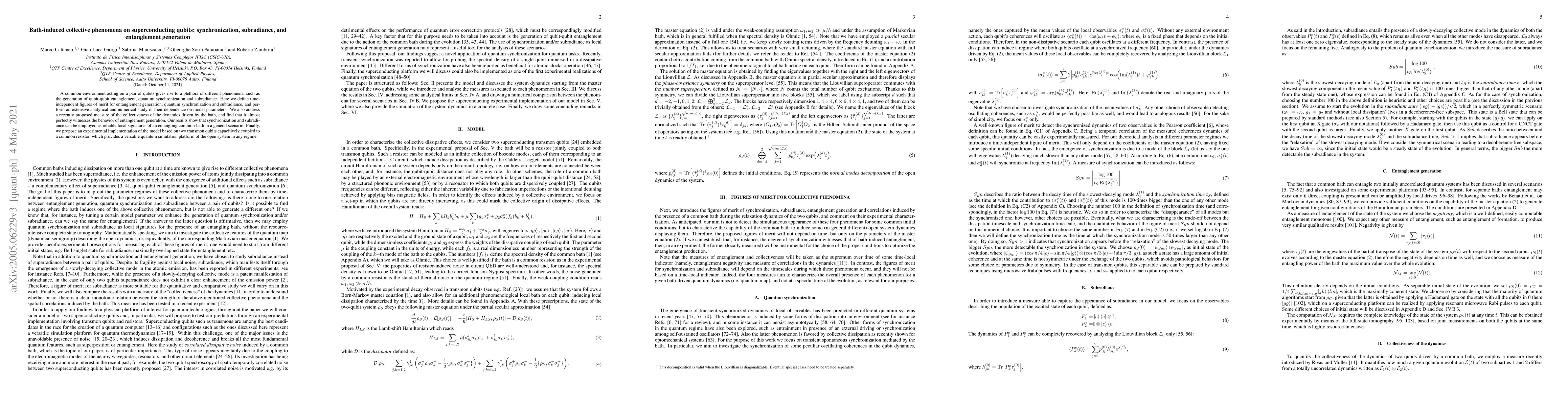This paper explores collective phenomena in superconducting qubits influenced by a shared environment, including entanglement generation, synchronization, and subradiance. It introduces figures of merit for these phenomena and demonstrates their dependence on model parameters, proposing a transmon-based experimental setup for quantum simulation.