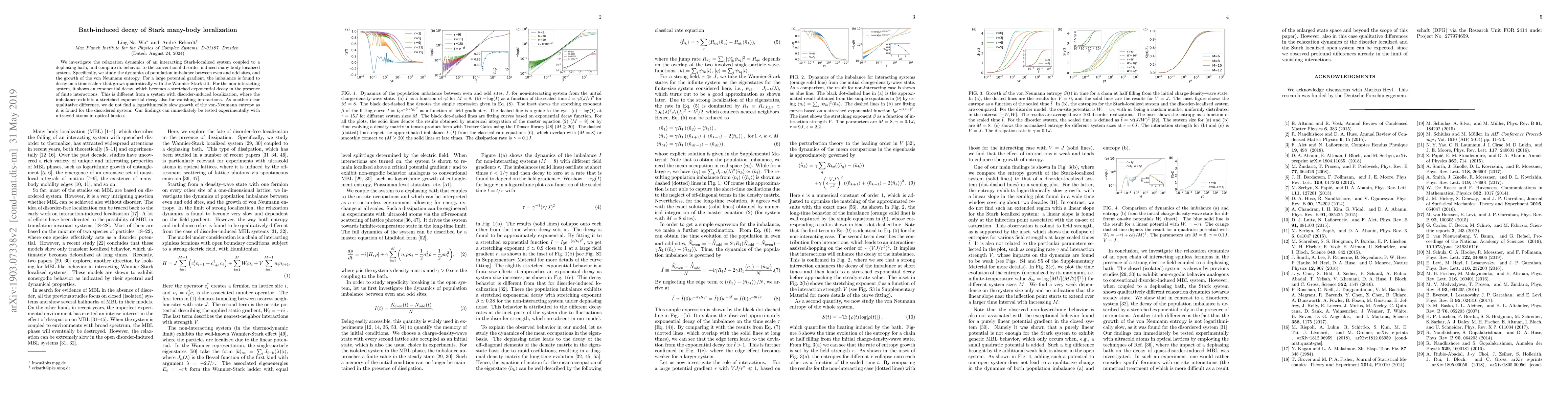 Researchers study how an interacting system with Stark localization decays over time, finding a quadratic decay for imbalance and a non-logarithmic entropy growth compared to disorder-induced localization.