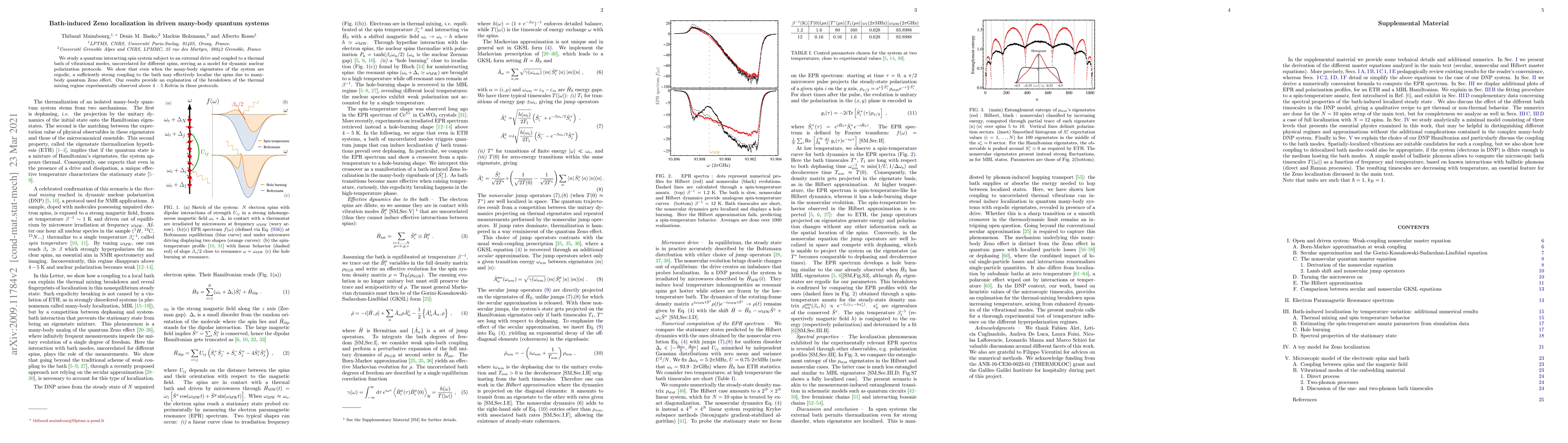 This paper investigates a driven quantum spin system coupled to a thermal bath, demonstrating that strong bath coupling can lead to bath-induced Zeno localization despite ergodic many-body eigenstates, explaining the observed breakdown of thermal mixing above 4-5 Kelvin. The effect is evidenced by the characteristic hole-burning shape in the electron paramagnetic resonance spectrum.