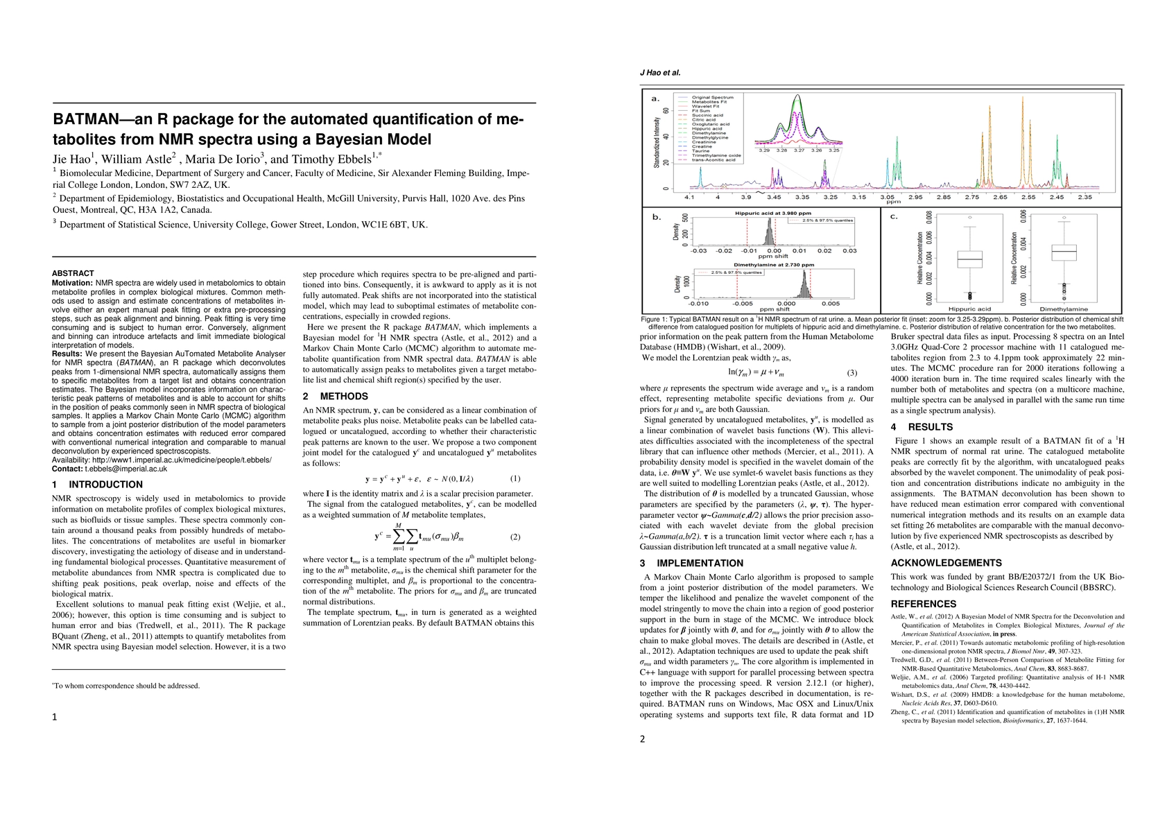 Motivation: NMR spectra are widely used in metabolomics to obtain metabolite profiles in complex biological mixtures. Common methods used to assign and estimate concentrations of metabolites involve either an expert manual peak fitting or extra pre-processing steps, such as peak alignment and binning. Peak fitting is very time consuming and is subject to human error. Conversely, alignment and binning can introduce artefacts and limit immediate biological interpretation of models. Results: We present the Bayesian AuTomated Metabolite Analyser for NMR spectra (BATMAN), an R package which deconvolutes peaks from 1-dimensional NMR spectra, automatically assigns them to specific metabolites from a target list and obtains concentration estimates. The Bayesian model incorporates information on charac-teristic peak patterns of metabolites and is able to account for shifts in the position of peaks commonly seen in NMR spectra of biological samples. It applies a Markov Chain Monte Carlo (MCMC) algorithm to sample from a joint posterior distribution of the model parameters and obtains concentration estimates with reduced error compared with conventional numerical integration and comparable to manual deconvolution by experienced spectroscopists. Availability: http://www1.imperial.ac.uk/medicine/people/t.ebbels/ Contact: [email protected]