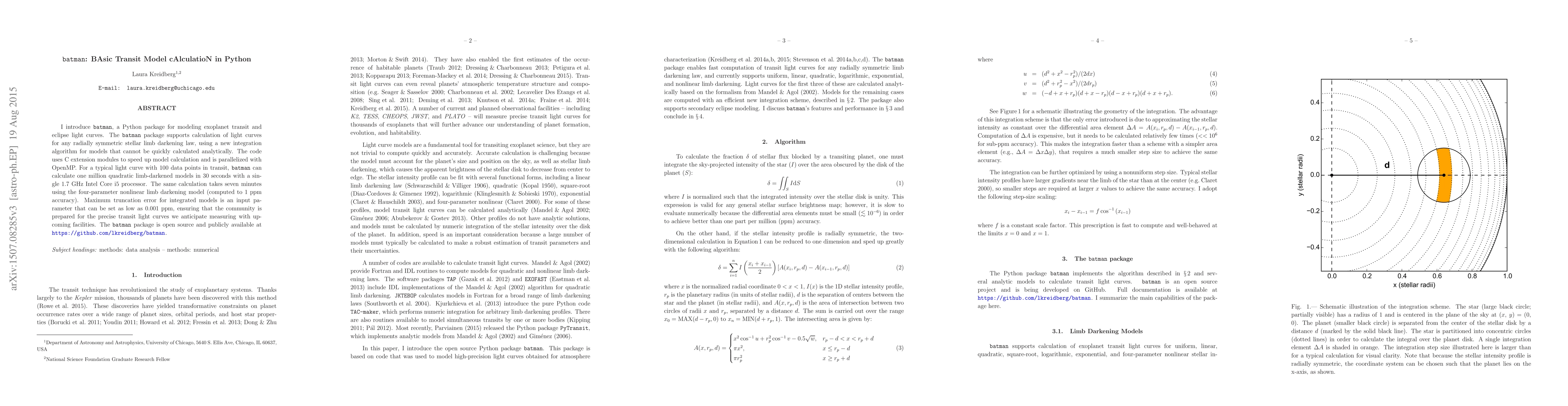 The paper introduces "batman," a Python package for modeling exoplanet transit light curves, featuring fast computation and high precision for various limb darkening models, and is available open-source for the research community. The package leverages C extensions and parallelization for efficient calculations, achieving rapid model generation suitable for upcoming high-precision transit measurements.