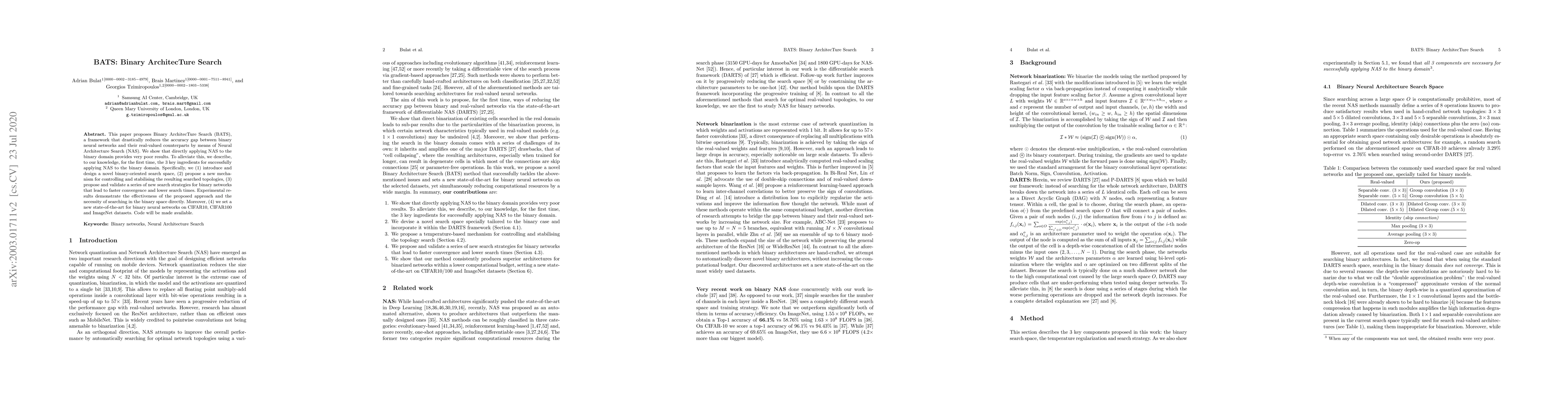 The paper proposes BATS, a framework for Neural Architecture Search (NAS) that significantly reduces the accuracy gap between binary neural networks and their real-valued counterparts. The authors introduce a novel binary-oriented search space, a mechanism for stabilizing searched topologies, and new search strategies for faster convergence, achieving state-of-the-art results on CIFAR10, CIFAR100, and ImageNet datasets.