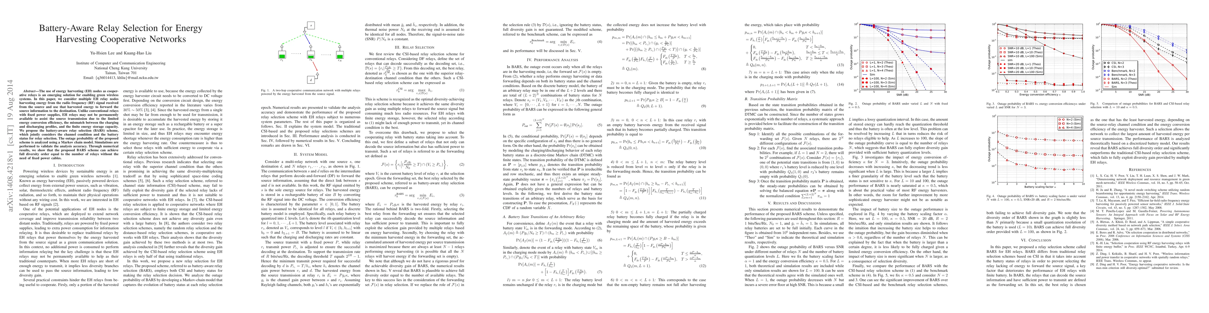 This paper proposes a battery-aware relay selection (BARS) scheme for energy harvesting cooperative networks, considering both channel conditions and battery status for relay selection. The scheme achieves full diversity order using simulations to validate its analytical model and demonstrate its effectiveness.