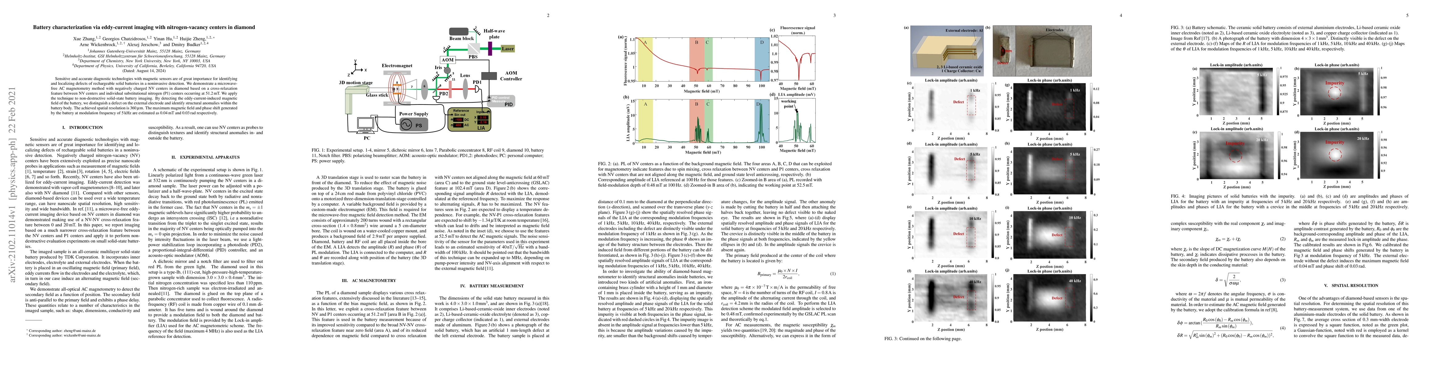 This work introduces a novel approach to battery characterization using NV centers in diamond, offering a microwave-free method with enhanced sensitivity and reduced magnetic field dependence, enabling non-invasive detection of battery defects and structural anomalies.