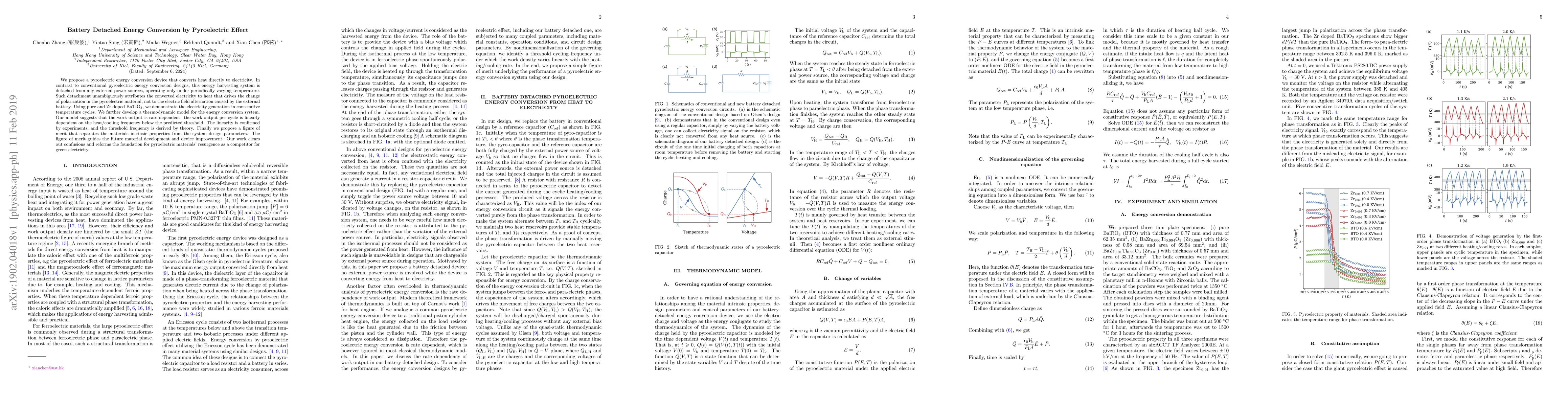 We propose a pyroelectric energy conversion device that converts heat directly to electricity. In contrast to conventional pyroelectric energy conversion designs, this energy harvesting system is detached from any external power sources, operating only under periodically varying temperature. Such detachment unambiguously attributes the converted electricity to heat that drives the change of polarization in the pyroelectric material, not to the electric field alternation caused by the external battery. Using pure and Zr doped BaTiO$_3$, we demonstrate the electricity generation in consecutive temperature cycles. We further develop a thermodynamic model for the energy conversion system. Our model suggests that the work output is rate dependent: the work output per cycle is linearly dependent on the heat/cooling frequency below the predicted threshold. The linearity is confirmed by experiments, and the threshold frequency is derived by theory. Finally we propose a figure of merit that separates the materials intrinsic properties from the system design parameters. The figure of merit guides the future material development and device improvement. Our work clears out confusions and reforms the foundation for pyroelectric materials' resurgence as a competitor for green electricity.