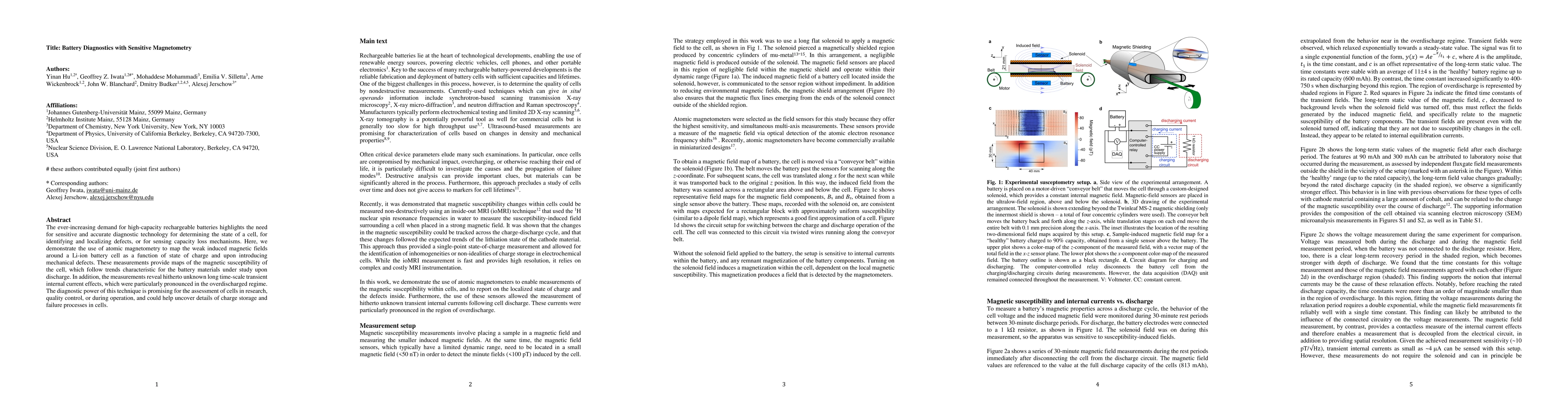 The ever-increasing demand for high-capacity rechargeable batteries highlights the need for sensitive and accurate diagnostic technology for determining the state of a cell, for identifying and localizing defects, or for sensing capacity loss mechanisms. Here, we demonstrate the use of atomic magnetometry to map the weak induced magnetic fields around a Li-ion battery cell as a function of state of charge and upon introducing mechanical defects. These measurements provide maps of the magnetic susceptibility of the cell, which follow trends characteristic for the battery materials under study upon discharge. In addition, the measurements reveal hitherto unknown long time-scale transient internal current effects, which were particularly pronounced in the overdischarged regime. The diagnostic power of this technique is promising for the assessment of cells in research, quality control, or during operation, and could help uncover details of charge storage and failure processes in cells.