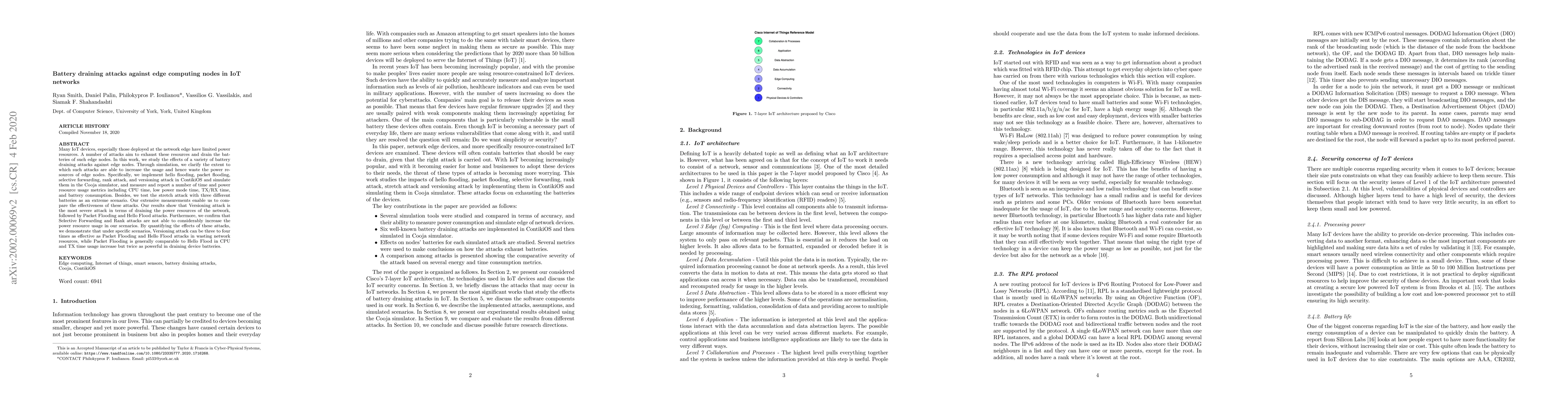 Many IoT devices, especially those deployed at the network edge have limited power resources. A number of attacks aim to exhaust these resources and drain the batteries of such edge nodes. In this work, we study the effects of a variety of battery draining attacks against edge nodes. Through simulation, we clarify the extent to which such attacks are able to increase the usage and hence waste the power resources of edge nodes. Specifically, we implement hello flooding, packet flooding, selective forwarding, rank attack, and versioning attack in ContikiOS and simulate them in the Cooja simulator, and measure and report a number of time and power resource usage metrics including CPU time, low power mode time, TX/RX time, and battery consumption. Besides, we test the stretch attack with three different batteries as an extreme scenario. Our extensive measurements enable us to compare the effectiveness of these attacks. Our results show that Versioning attack is the most severe attack in terms of draining the power resources of the network, followed by Packet Flooding and Hello Flood attacks. Furthermore, we confirm that Selective Forwarding and Rank attacks are not able to considerably increase the power resource usage in our scenarios. By quantifying the effects of these attacks, we demonstrate that under specific scenarios, Versioning attack can be three to four times as effective as Packet Flooding and Hello Flood attacks in wasting network resources, while Packet Flooding is generally comparable to Hello Flood in CPU and TX time usage increase but twice as powerful in draining device batteries.